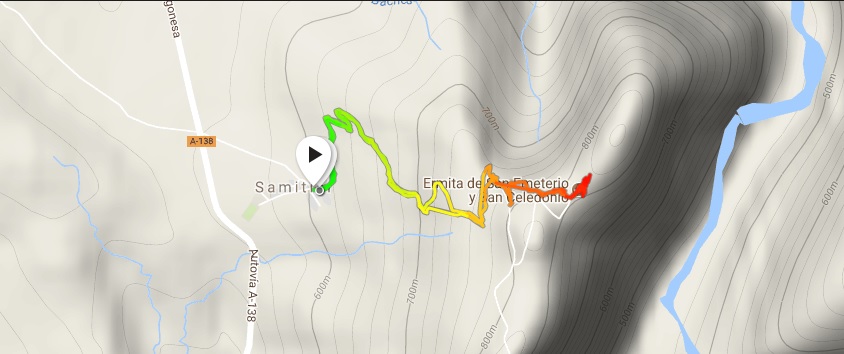 Altitud mínima y máxima: 614 metros en el pueblo de Samitier, 866 m en el castillo.