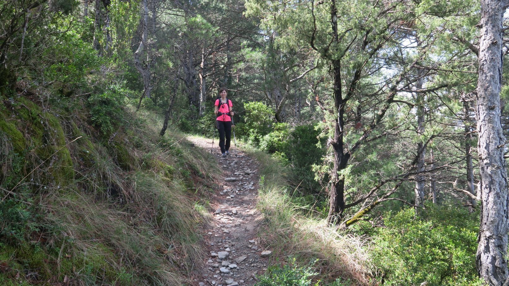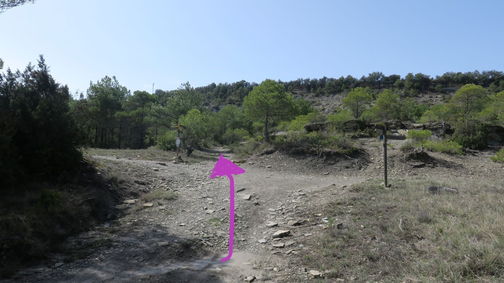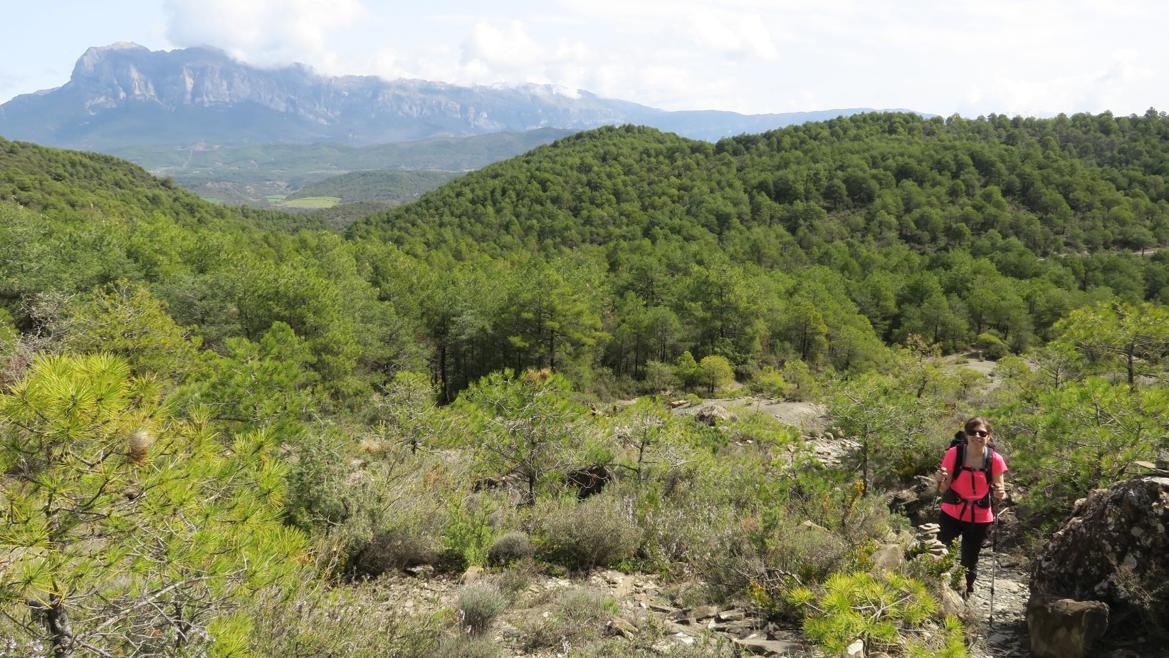 Nuevo cruce de caminos en este punto; aquí debemos virar al oeste por un sendero que se introduce entre los pinos (“Partara – Río Ena”). A partir de aquí el ascenso, cómodo y por la sombra, serpentea por la cresta de la sierra ofreciéndonos, periódicamente, amplias vistas de la zona.