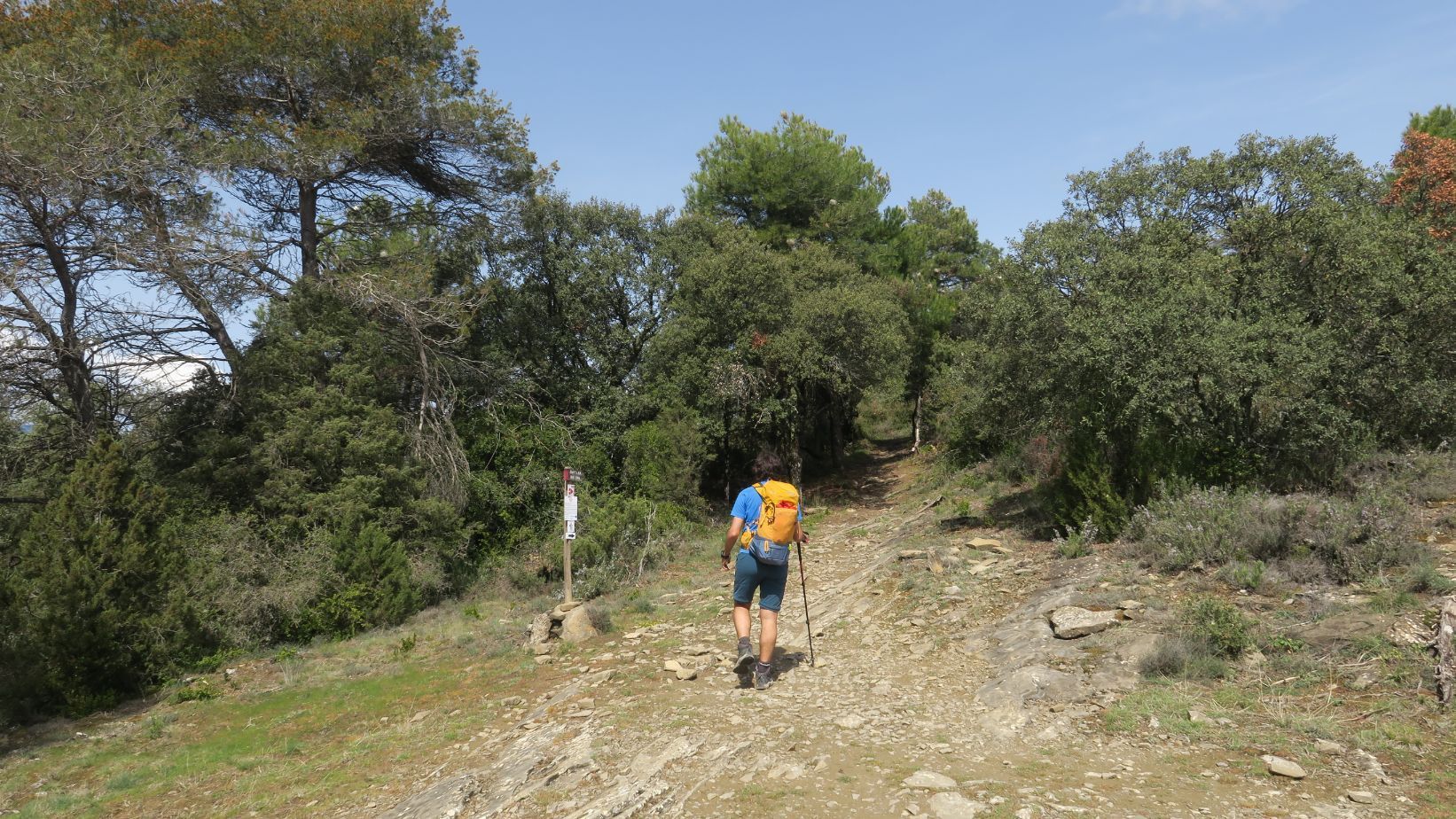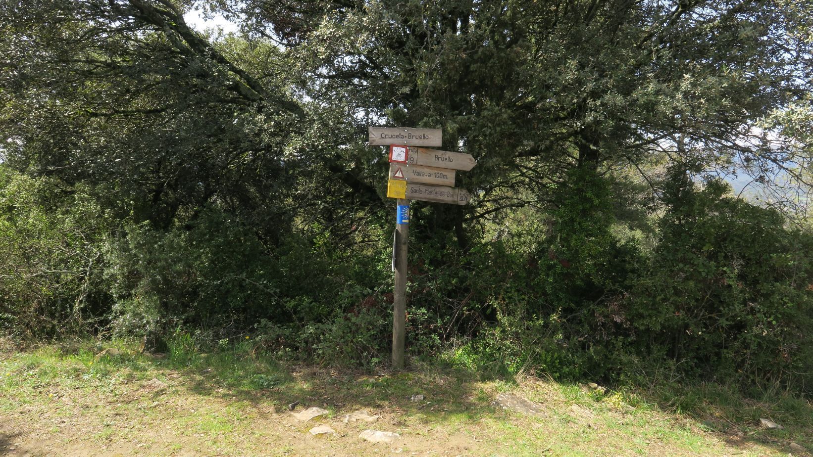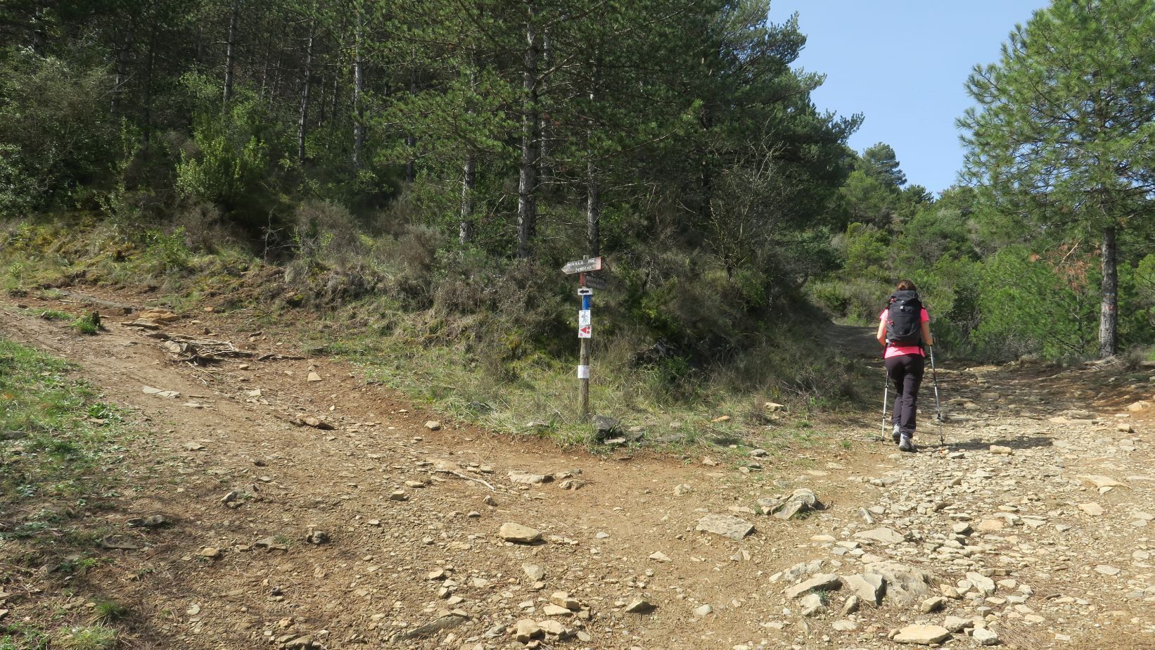 Alternando tramos sombríos con otros en los que el sol nos golpea con fuerza, ganamos progresivamente altitud por la pista, hasta toparnos con un gran cruce de caminos en el que existen múltiples señalizaciones. Nosotros únicamente continuamos en línea recta (carteles “Santa María de Buil” y “Cruceta Bruello”), rumbo suroeste para, enseguida, acometer el tramo de ascenso más duro por un sendero que recorre una zona de rocas grisáceas salpicadas por pequeños arbustos y jóvenes pinos.