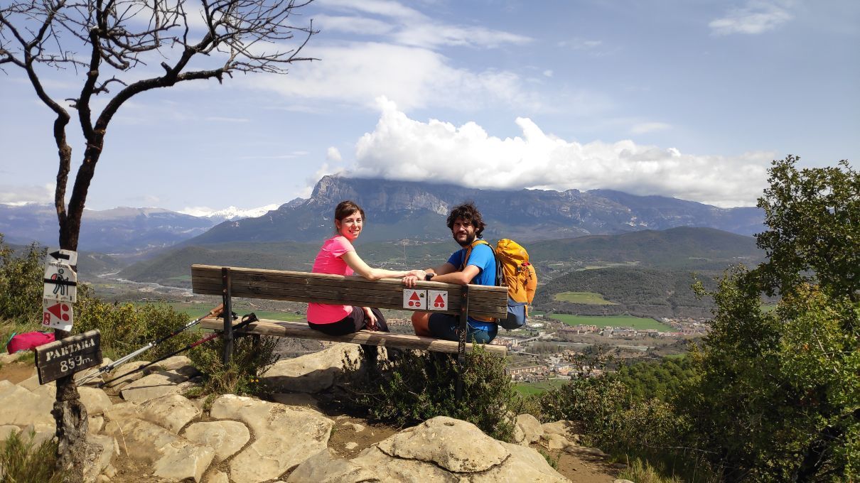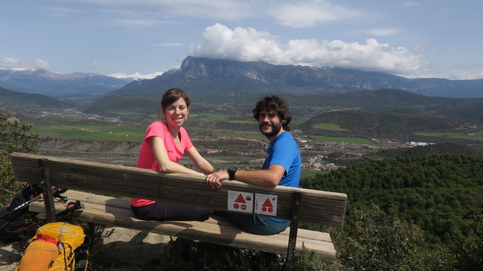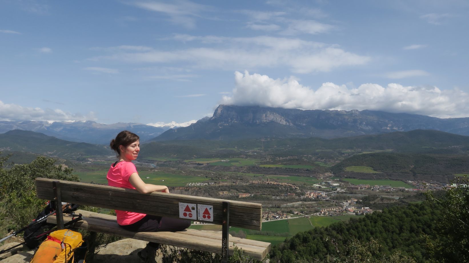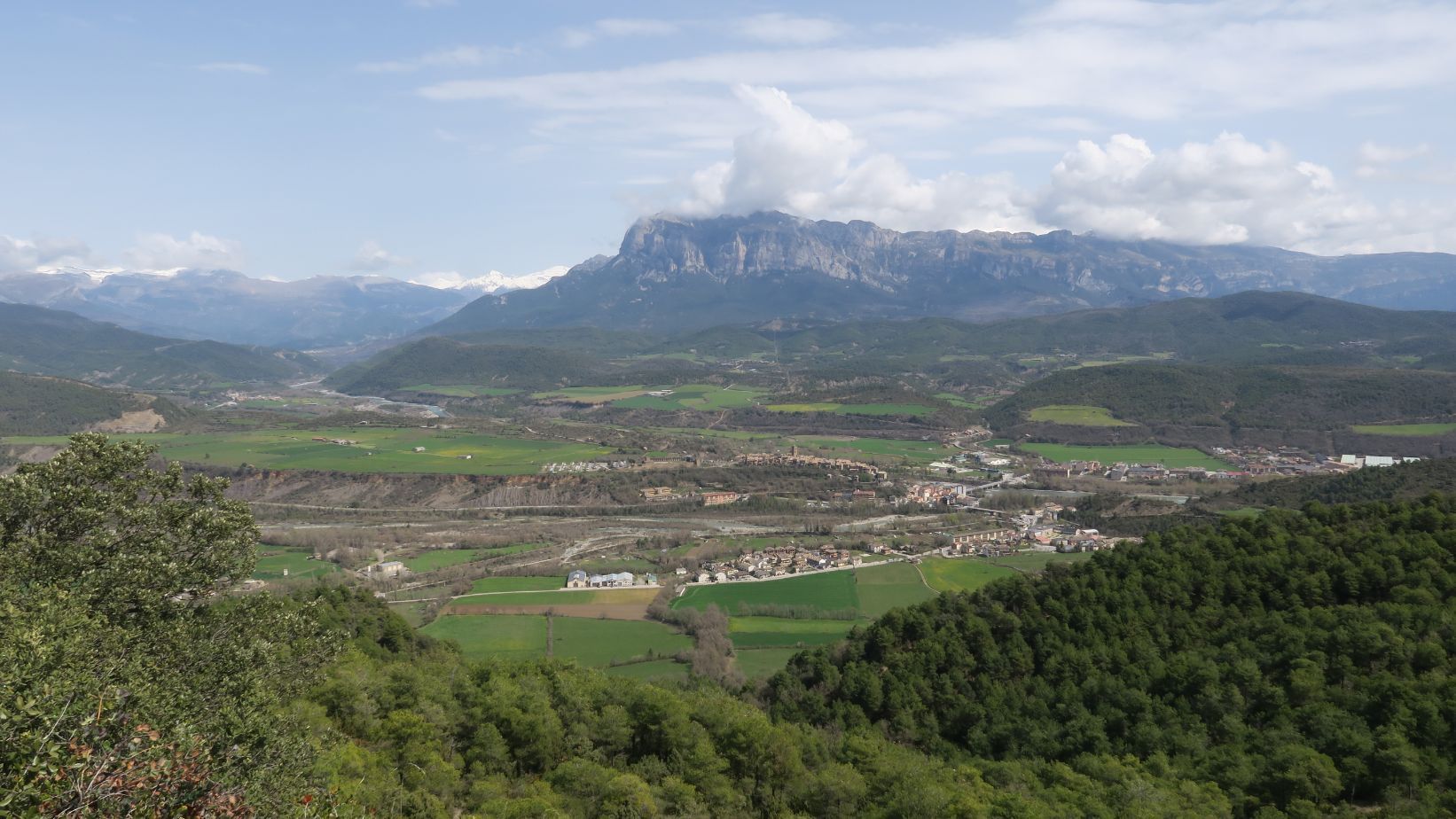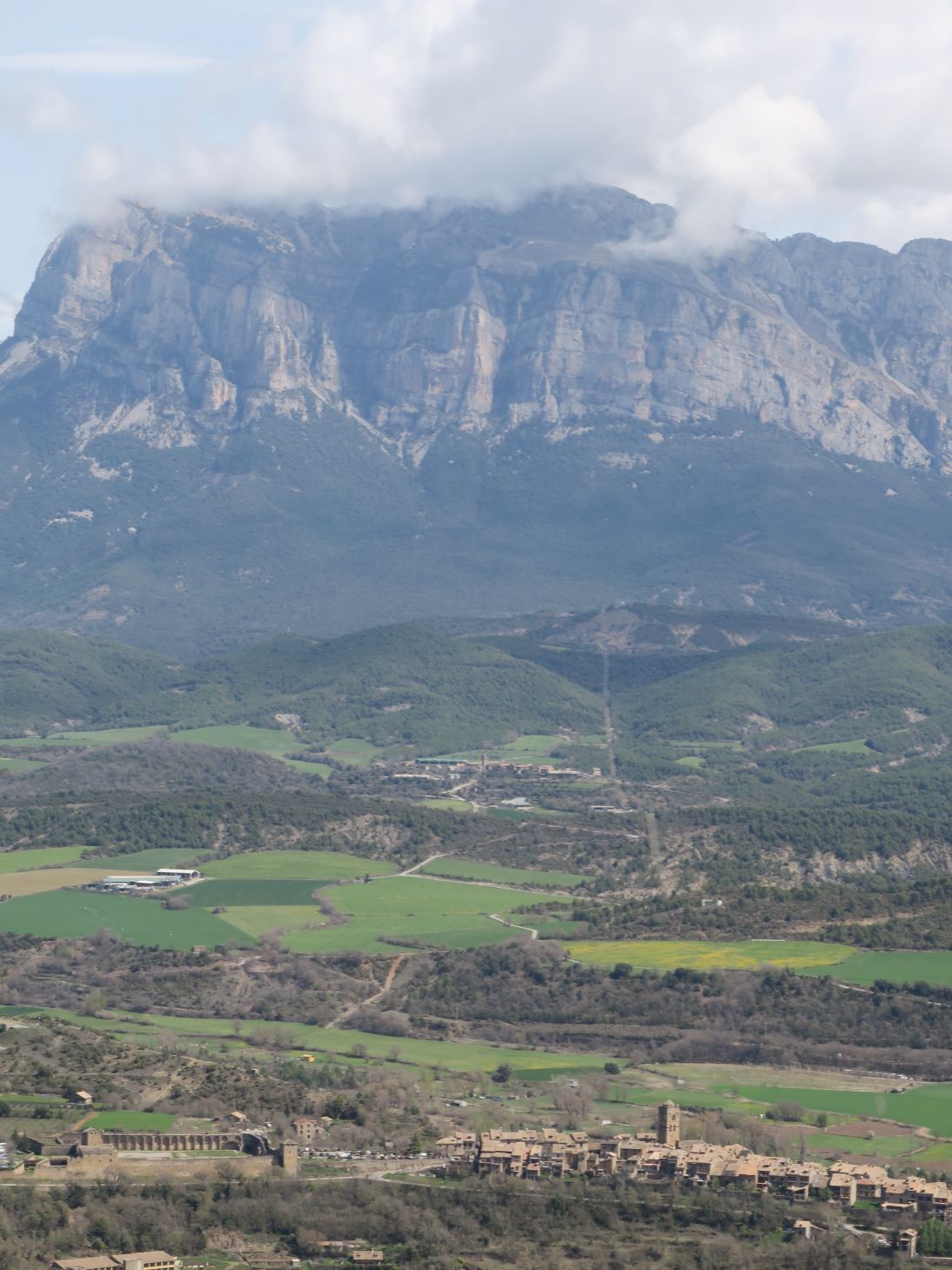 Día soleado, temperatura agradable y estamos solos aquí. Buen momento para sacar los bocadillos y beber algo mientras divisamos las montañas que conforman la estampa de postal. Aunque algunas se ocultan parcialmente tras las nubes, Mallo Marmorés/Cilindro de Marboré, Monte Perdido/Punta de Treserols, Pico Añisclo, Punta Fulsa, Punta Suelza y Peña Montañesa, entre otros, captan nuestra atención. Bajo la mole de la Peña, la población de L’Aínsa muestra una cara inédita para nosotros, diminuta desde las alturas.