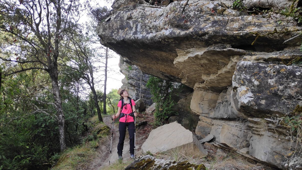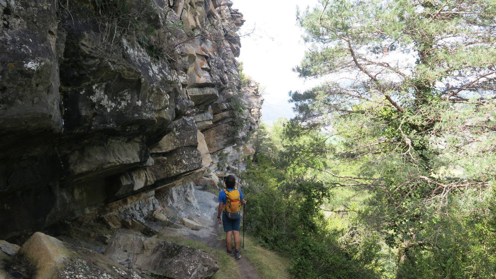 Aquí debemos tomar un sendero que desciende hacia la derecha (dirección “Selva norte – El pinar”) y que durante unos centenares de metros desciende suavemente bajo unos espectaculares escarpes rocosos, conformando el que sea, probablemente, el paso más extraordinario de toda la ruta.