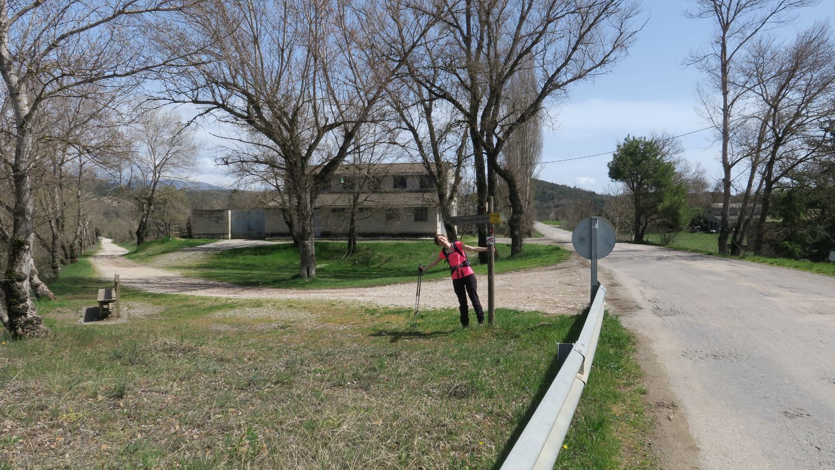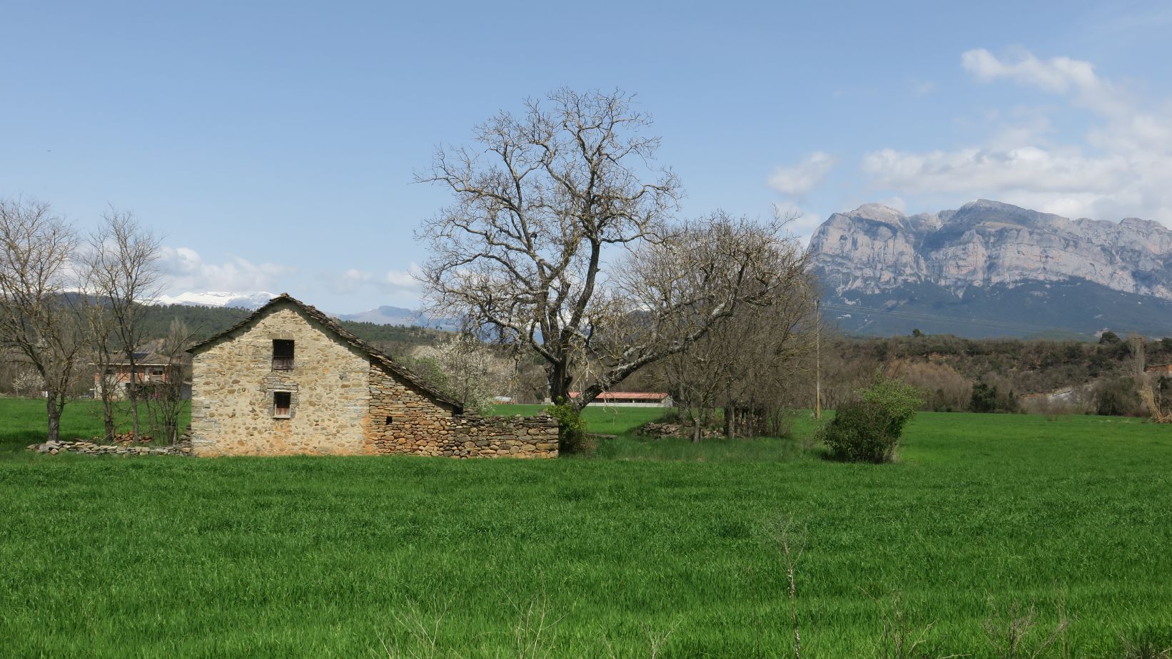 Una vez cruzado el río debemos seguir por una pista durante unos centenares de metros, rumbo norte, hasta llegar a la intersección con la carretera A-2205. En este punto viramos a la derecha, para ir llaneando ya por terreno abierto con campos de cultivo verdes y la visión de la Peña Montañesa a nuestra izquierda.
