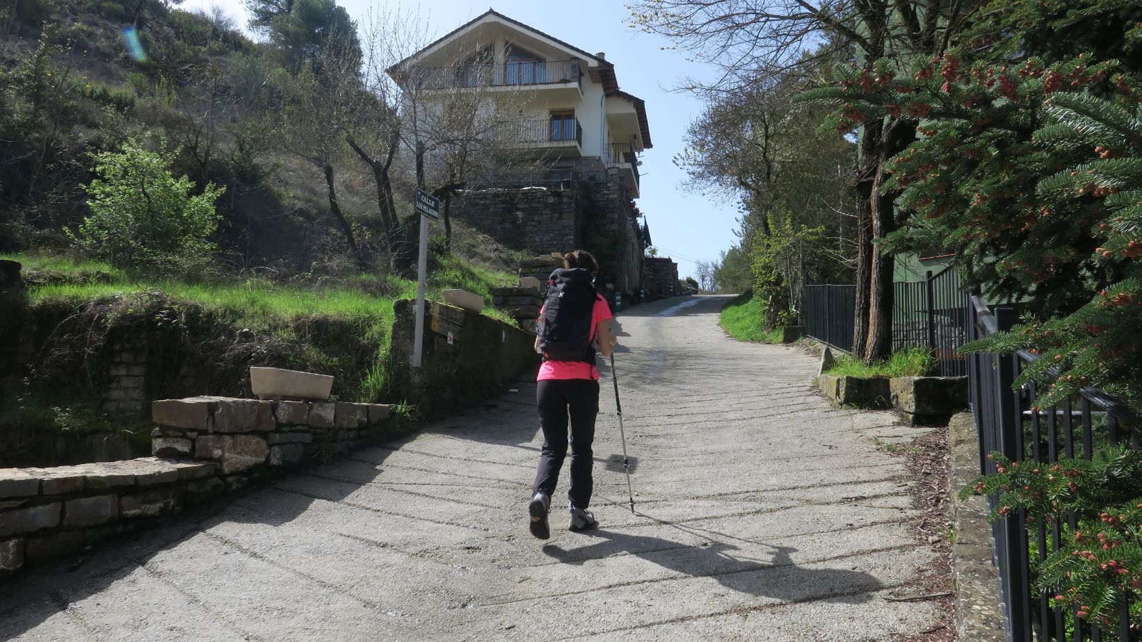 La ruta comienza, señalizada con un pequeño panel indicador, en una calle situada justo detrás del Hotel Mesón de L’Aínsa, inconfundible con su color verde.