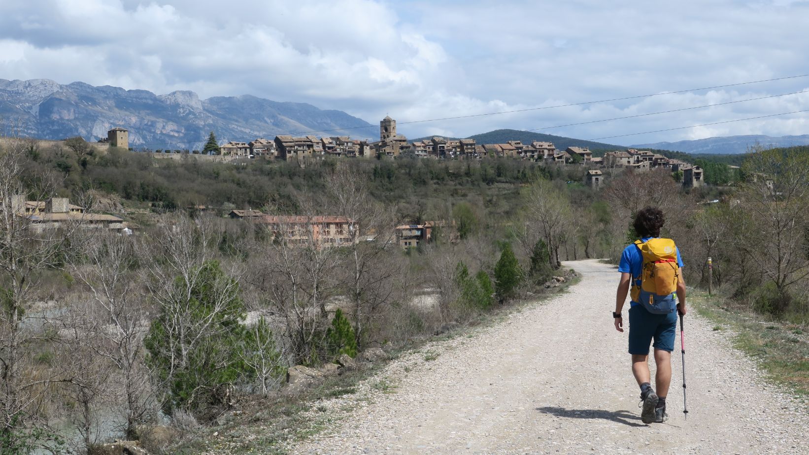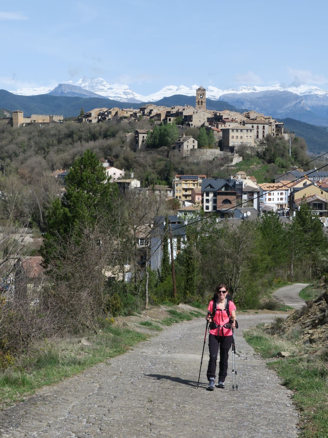 Nuestros primeros pasos remontan la asfaltada Calle Los Palacios para, pronto, llevarnos por una pista que asciende cómoda y, en pocos minutos, nos permite obtener una excelente panorámica de L’Aínsa con las nevadas cumbres de Ordesa de fondo.