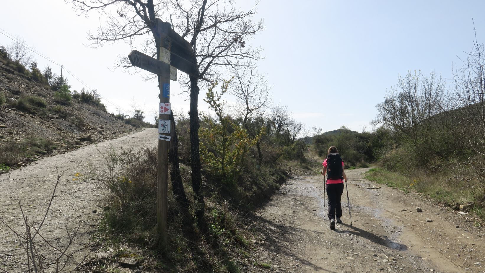 La pista, en continuo pero suave ascenso, rodea el comedero por su parte izquierda, siguiendo las indicaciones nuevamente hacia Santa María de Buil. Pronto nos topamos con otro desvío (“Morillo por sendero”), que debemos evitar para continuar por la pista ya internándonos en un tramo más boscoso.