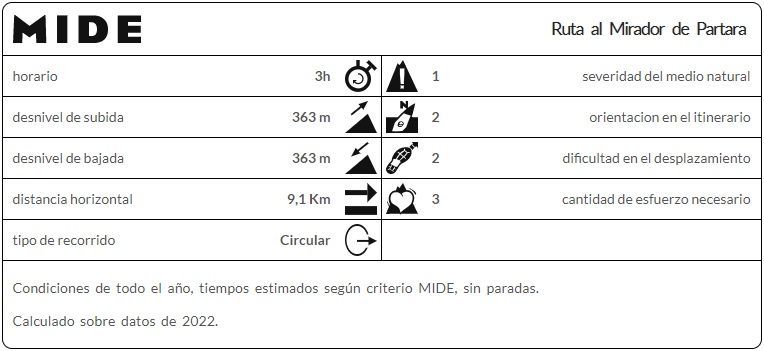 Dejamos a nuestra derecha un desvío (Aínsa por Fobón – Aínsa por Partara Express) que nos permitiría descender o ascender más directamente al mirador, y que puede ser empleado para otras rutas más breves por la zona. Siguiendo por el camino en que vamos, en pocos minutos más llegamos a la cima de Partara (4 km, 1 hora y 15 minutos, 859 metros), donde se sitúa el magnífico mirador y el banco de madera donde sentarnos a contemplar la enorme panorámica.
