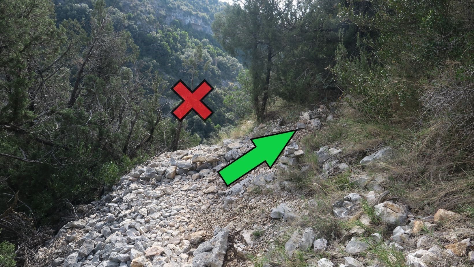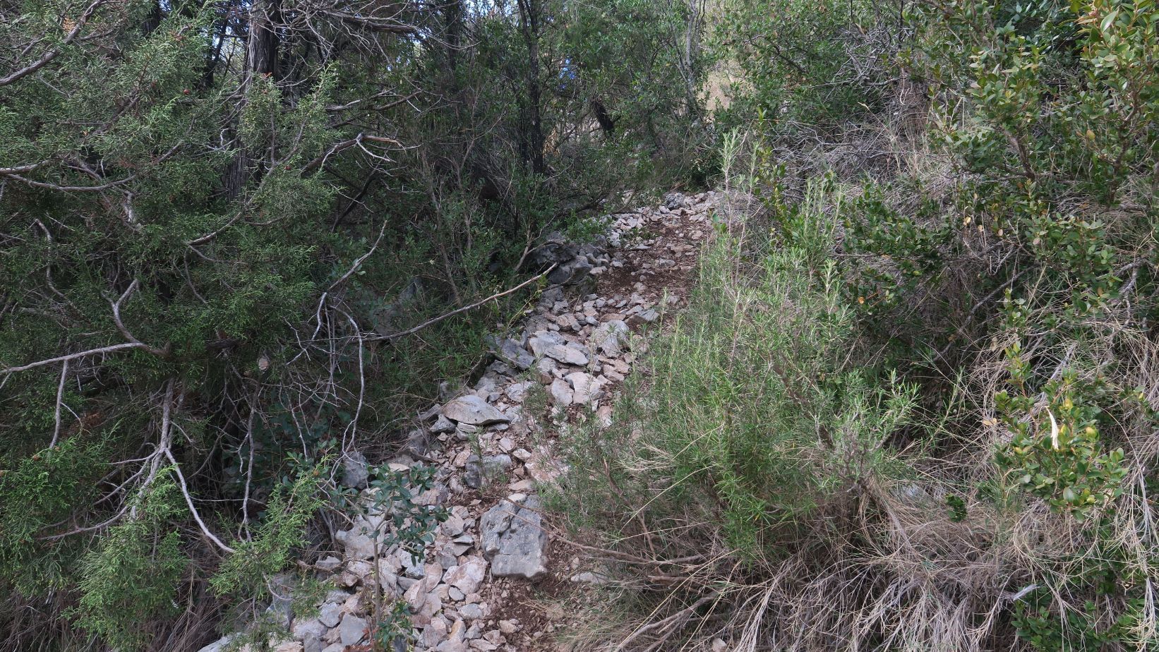 El camino gira bruscamente al llegar al seco cauce del barranco, tomando dirección sur. Es aquí cuando la senda, más estrecha, requiere mayor atención puesto que va ganando algo de altitud y a nuestra izquierda comienza a apreciarse una mayor caída. No obstante, la senda está protegida por vegetación en buena parte de este tramo, por lo que no supone ningún peligro ni problema para quienes padezcan de vértigo.
