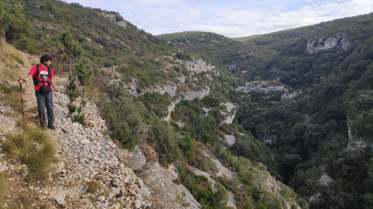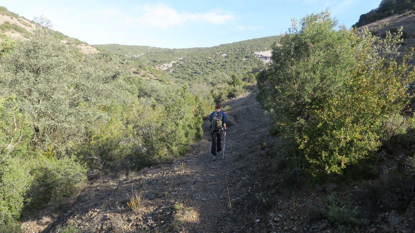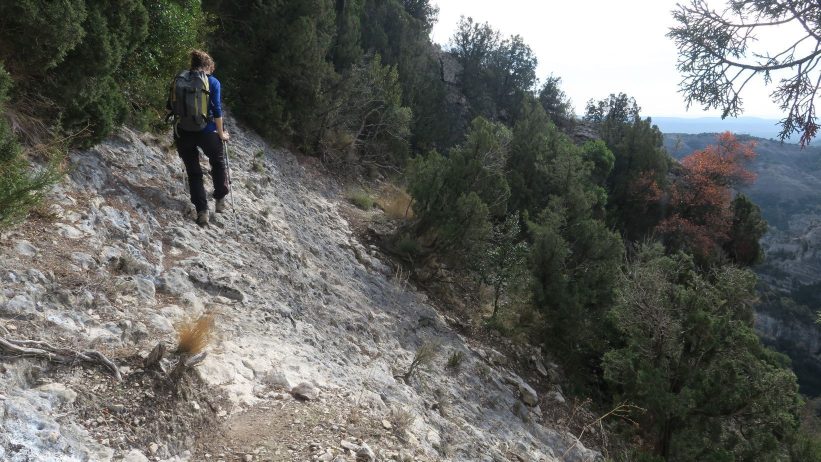 El camino, evidente, está señalizado con balizas de madera o hitos de piedra cada pocos metros, por lo que no tiene pérdida. Tras superar un tramo de descenso algo más pronunciado, aunque sencillo, por terreno rocoso, llegamos al fondo del barranco. Allí nos movemos entre carrascas, tomillo y sabinas, típica vegetación de la zona.