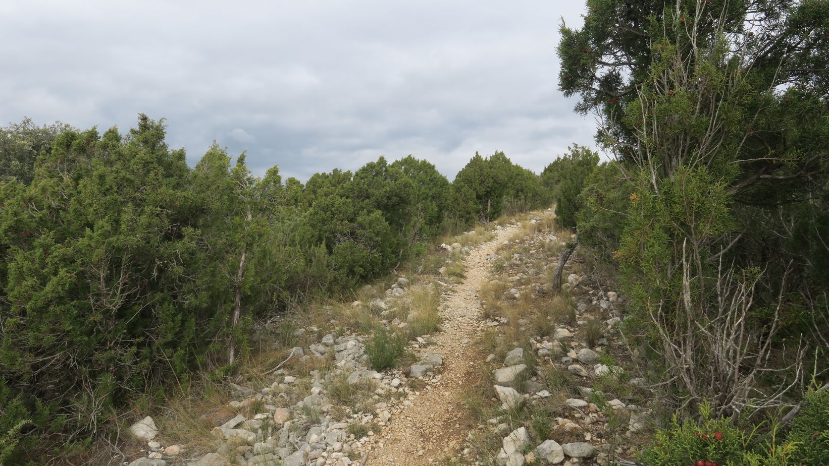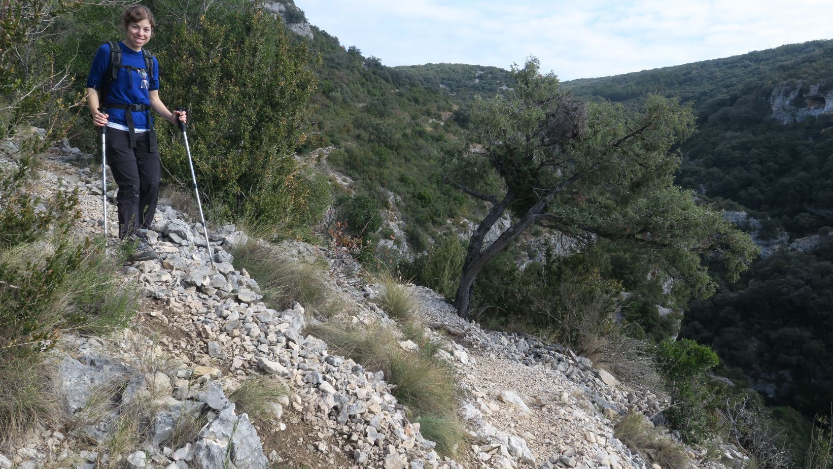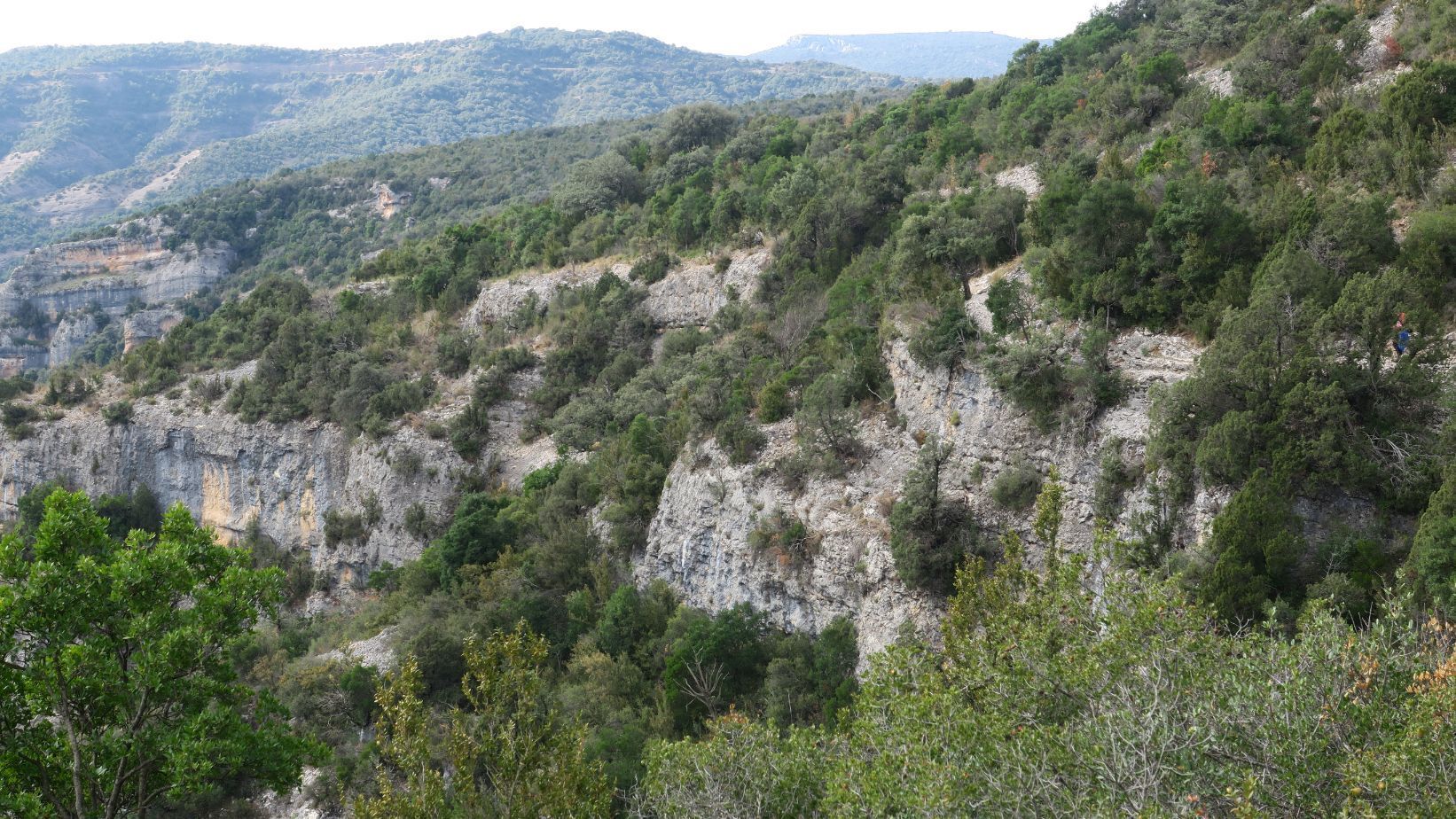 El camino, evidente, está señalizado con balizas de madera o hitos de piedra cada pocos metros, por lo que no tiene pérdida. Tras superar un tramo de descenso algo más pronunciado, aunque sencillo, por terreno rocoso, llegamos al fondo del barranco. Allí nos movemos entre carrascas, tomillo y sabinas, típica vegetación de la zona.
