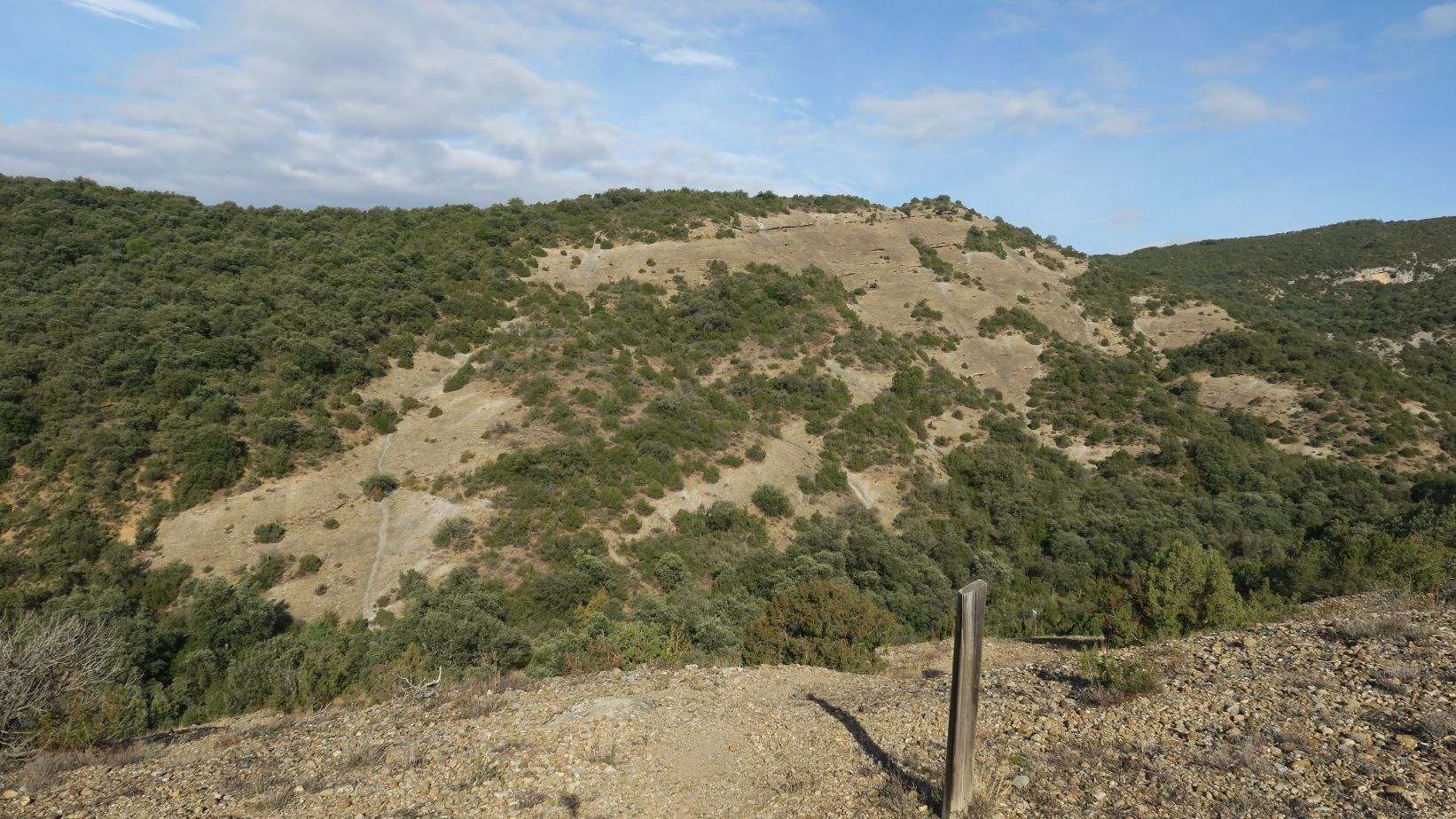 Tras unos breves minutos recorriendo el barranco la senda vuelve a ganar pendiente ascendente, llegando hasta un suave collado próximo al Tozal d’a Enclusa. Contemplamos un poco las vistas y seguimos caminando en rumbo norte/noreste, remontando una loma cubierta de arbustos y pequeño arbolado hasta llegar al Pinar de la Cunarda, repoblado hace unos 60 o 70 años. Allí encontramos un poste indicador, clave en nuestra ruta de hoy, puesto que marca el punto por el que regresaremos más adelante (3,35 km; 1 hora y 10 minutos, 880 metros).