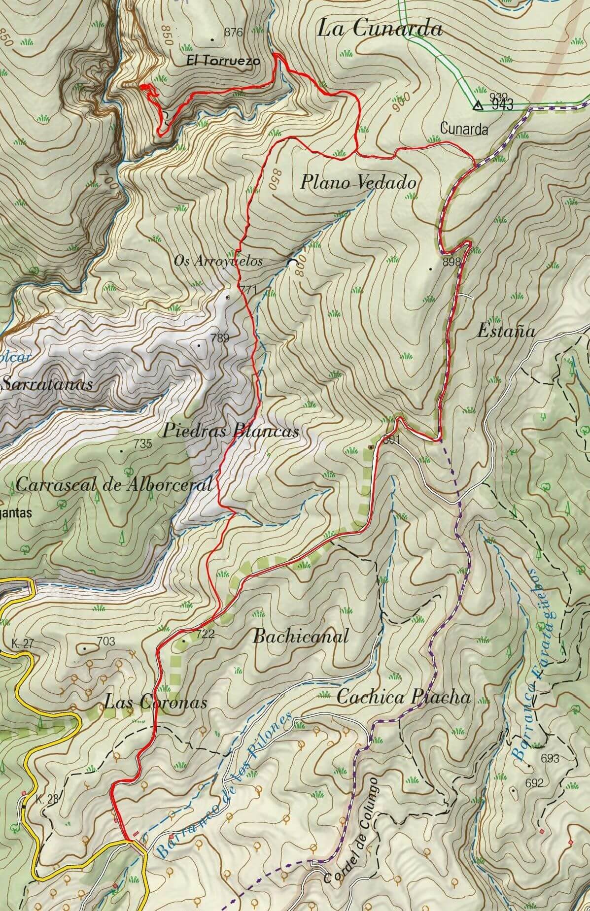 Itinerario: Aparcamiento – Pista de Suelves – Sendero que desciende al Barranco de la Palomera (Barranco de los Arruellos) – Pinar de la Cunarda (cruce de caminos) – Barranco del Tacho (Barranco de Baricolla) – Portal de la Cunarda – Barranco del Tacho – Pinar de la Cunarda – Pista de Suelves – Aparcamiento.