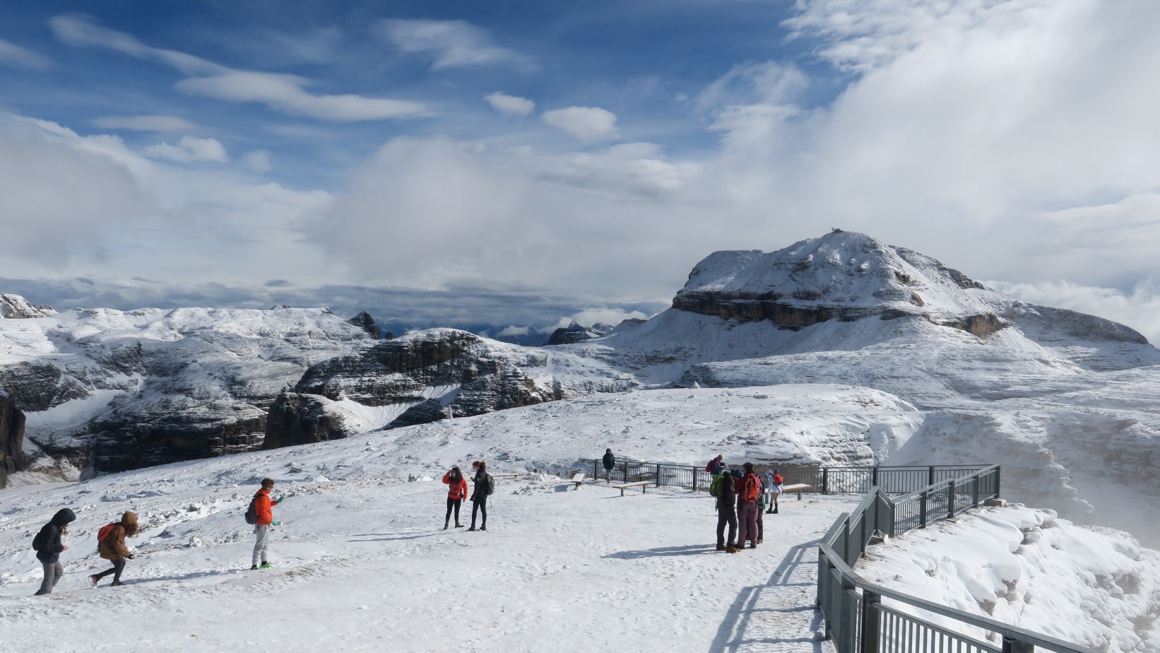 – Día 2: el día se levanta algo más despejado, lo que nos permite ver que ha nevado en las cumbres más altas. Nos dirigimos al Passo Pordoi y tomamos el funicular hasta el Sass Pordoi, a 2950 metros de altitud, que amanece completamente nevado y bellísimo. Regresamos a Vigo di Fassa, y allí tomamos el funicular Cattinaccio hasta Ciampedie, donde comenzamos la espectacular ruta senderista al Rifugio Re Alberto I, en el que pasamos la noche.