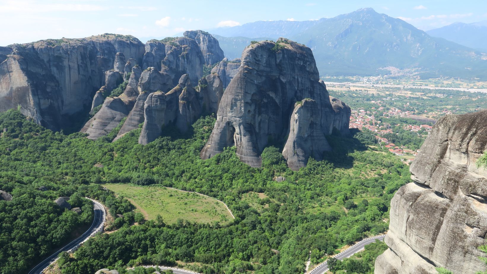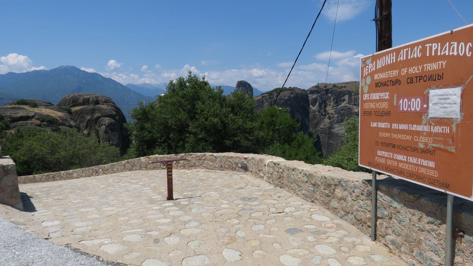 Regresamos al asfalto, para caminar unos cuatrocientos metros por el mismo hasta el desvío al Monasterio de Varlaam. En el propio desvío hay un aparcamiento de tierra junto al cual se encuentra otro mirador, también impresionante.
