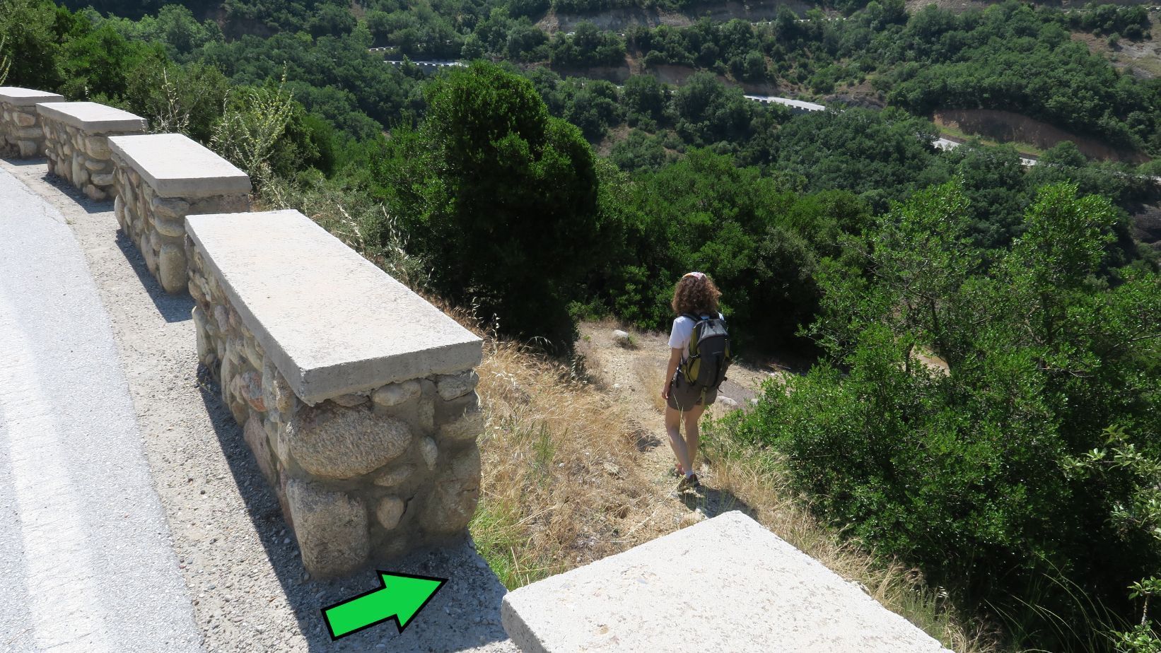 Enseguida llegamos a un cruce de caminos, evidentemente sin señalizar. Aunque ambas opciones (izquierda y derecha) nos llevarían a la carretera, para la ruta propuesta es mejor tomar la de la derecha ya que, en unos pocos minutos más, nos deja junto a la carretera y casi bajo el altivo Monasterio Varlaam, diminuto allá en lo alto de las rocas.