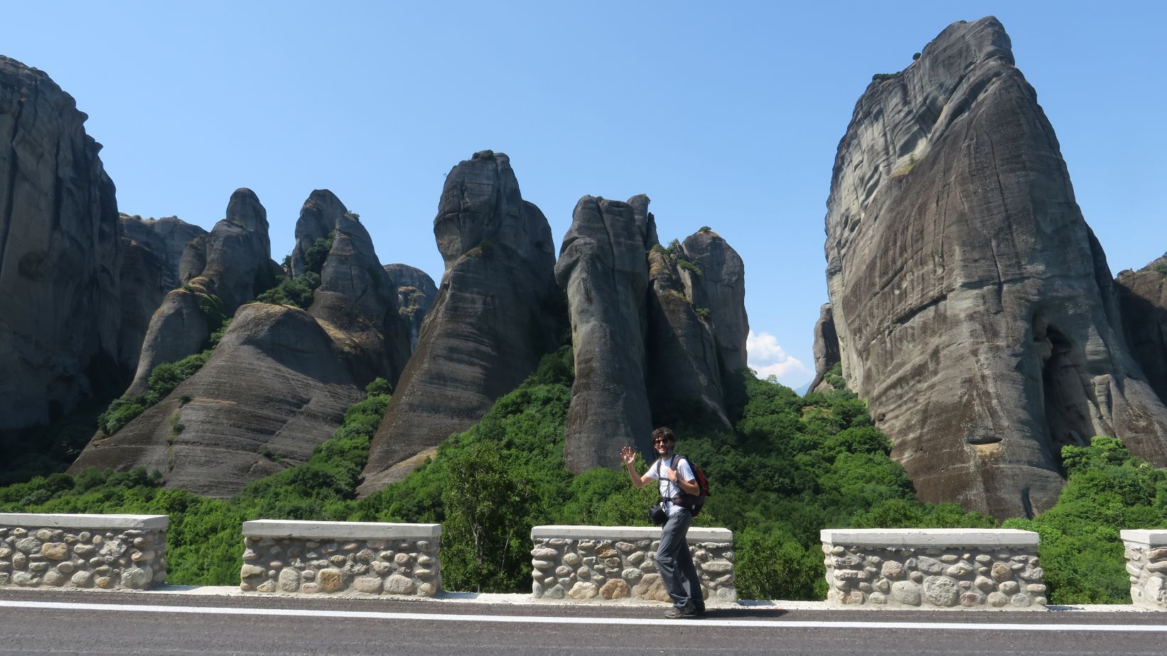 Salimos a la carretera y, en unos pocos metros, nos desviamos brevemente para asomarnos a un mirador con fastuosas vistas. Además de Grand Meteoron, desde aquí se obtiene una gran panorámica del Monasterio de Varlaam, con los monasterios de Roussanou y Agia Triada a lo lejos. ¡Menudo paisaje más singular!