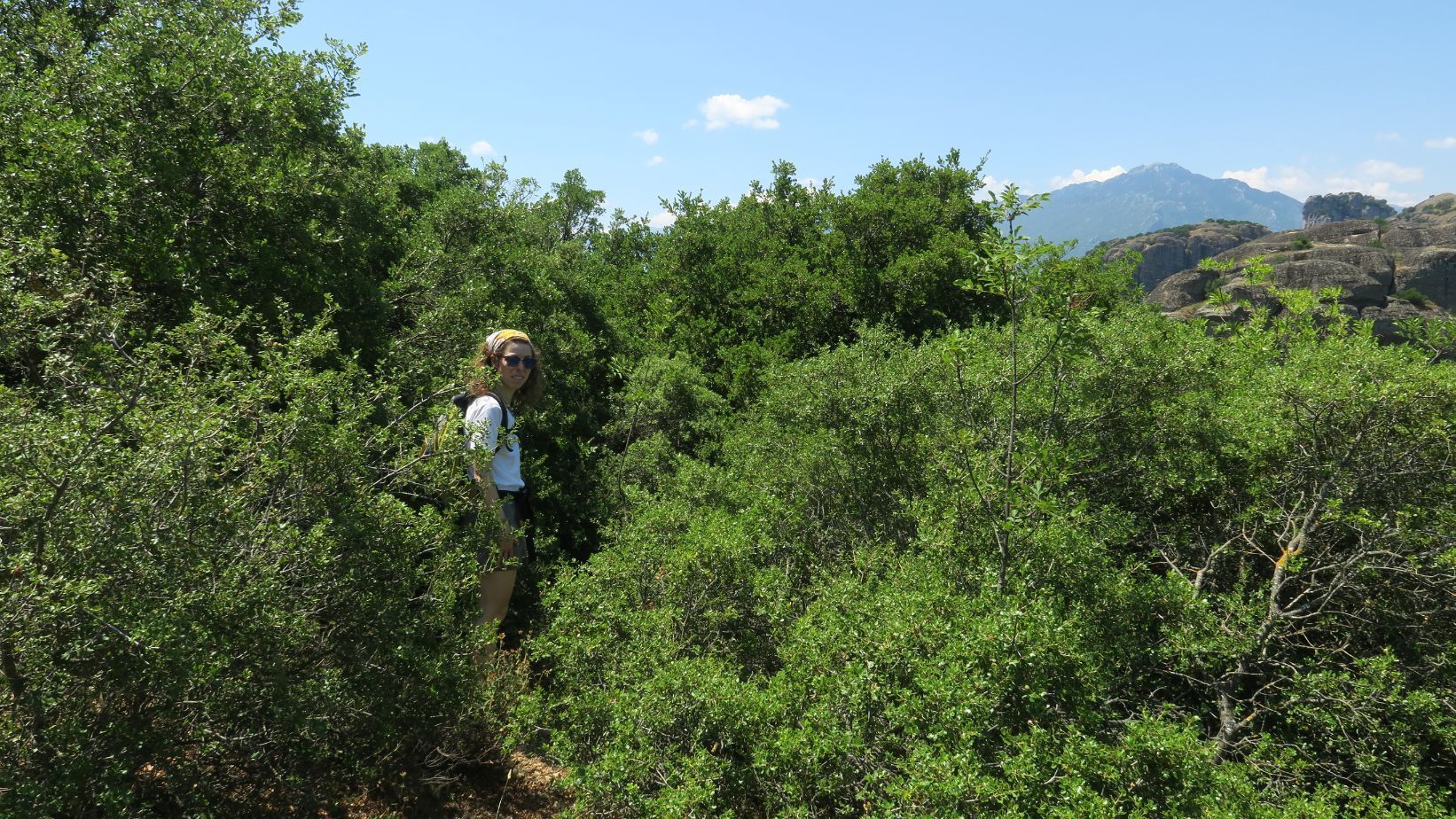 Lo tomamos y perdemos altitud progresivamente, por una senda estrecha, no señalizada y que transcurre entre hierbas secas, pequeños arbustos y algunas rocas grises de formas imposibles. Son rincones de Meteora poco visitados, que descubrimos en absoluta soledad, disfrutándolos al máximo.