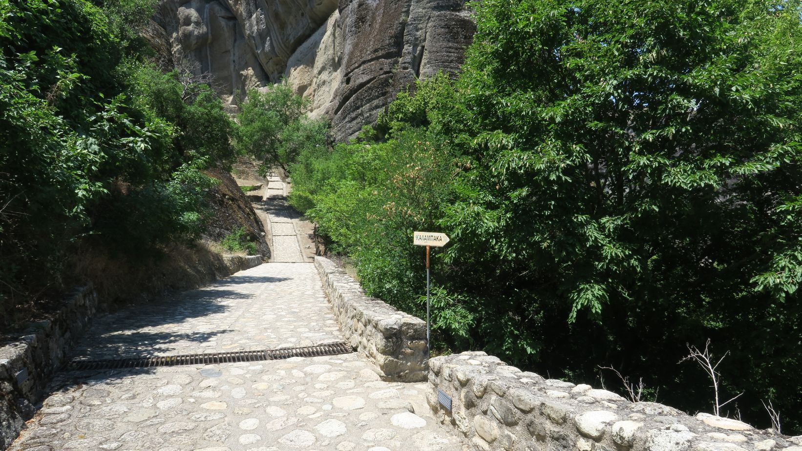 Estamos llegando al Monasterio Agia Triada (8,1 km; 3 horas; 519 metros), encaramado en lo alto de una enorme roca y, probablemente, uno de los más fotogénicos. Desde la carretera tomamos el camino, adoquinado, que nos lleva a la entrada del mismo. Sin embargo, un pequeño cartel (¡el único de la ruta!) nos indica que debemos desviarnos por un pequeño sendero para llegar a la localidad de Kalambaka.