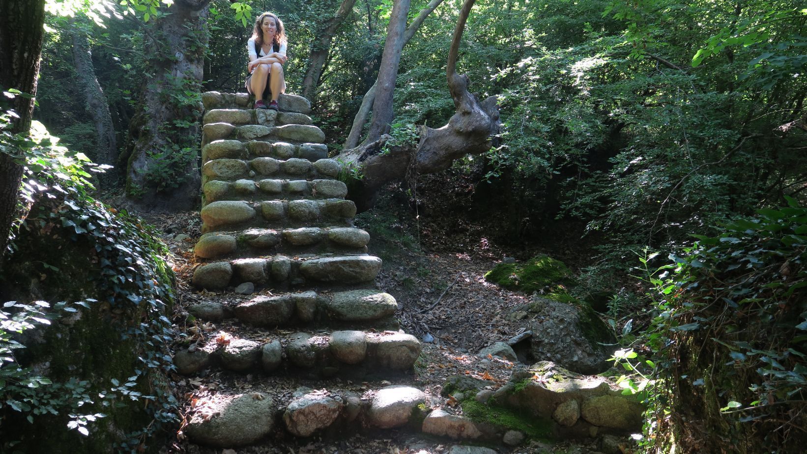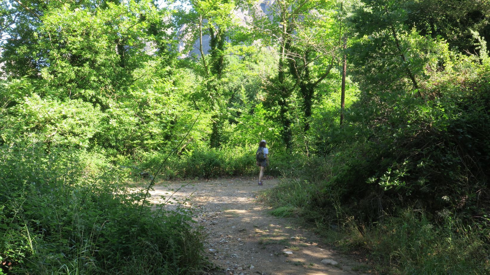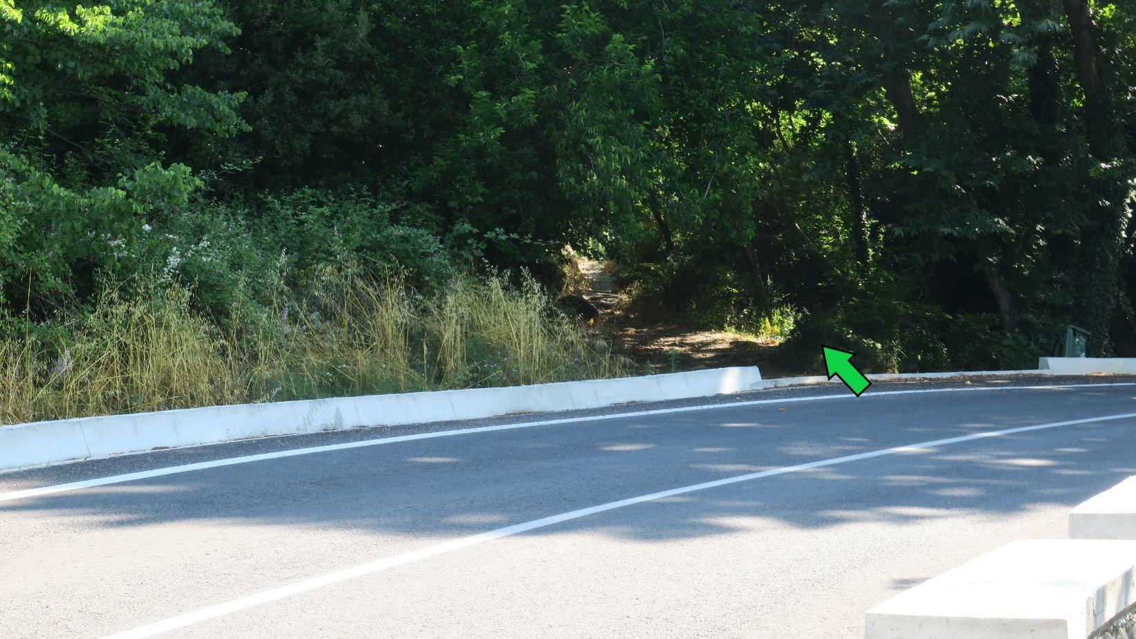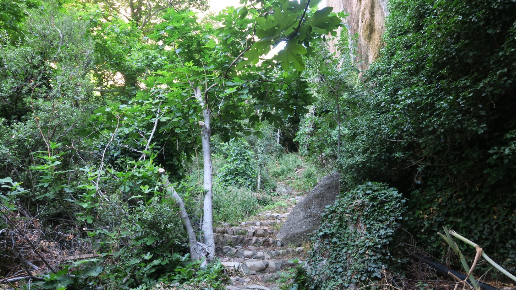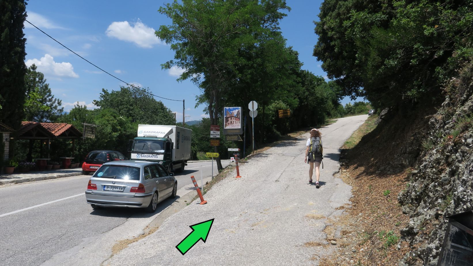 Primero ascendemos por tramo sombrío, boscoso, superando el desnivel por un camino cómodo con escaleras de piedra. Tras superar la entrada al monasterio, visitado el día previo, las escaleras se transforman en senda estrecha y serpenteante, que nos lleva otra vez (y en constante ascenso) a la carretera, ahora en su parte alta.