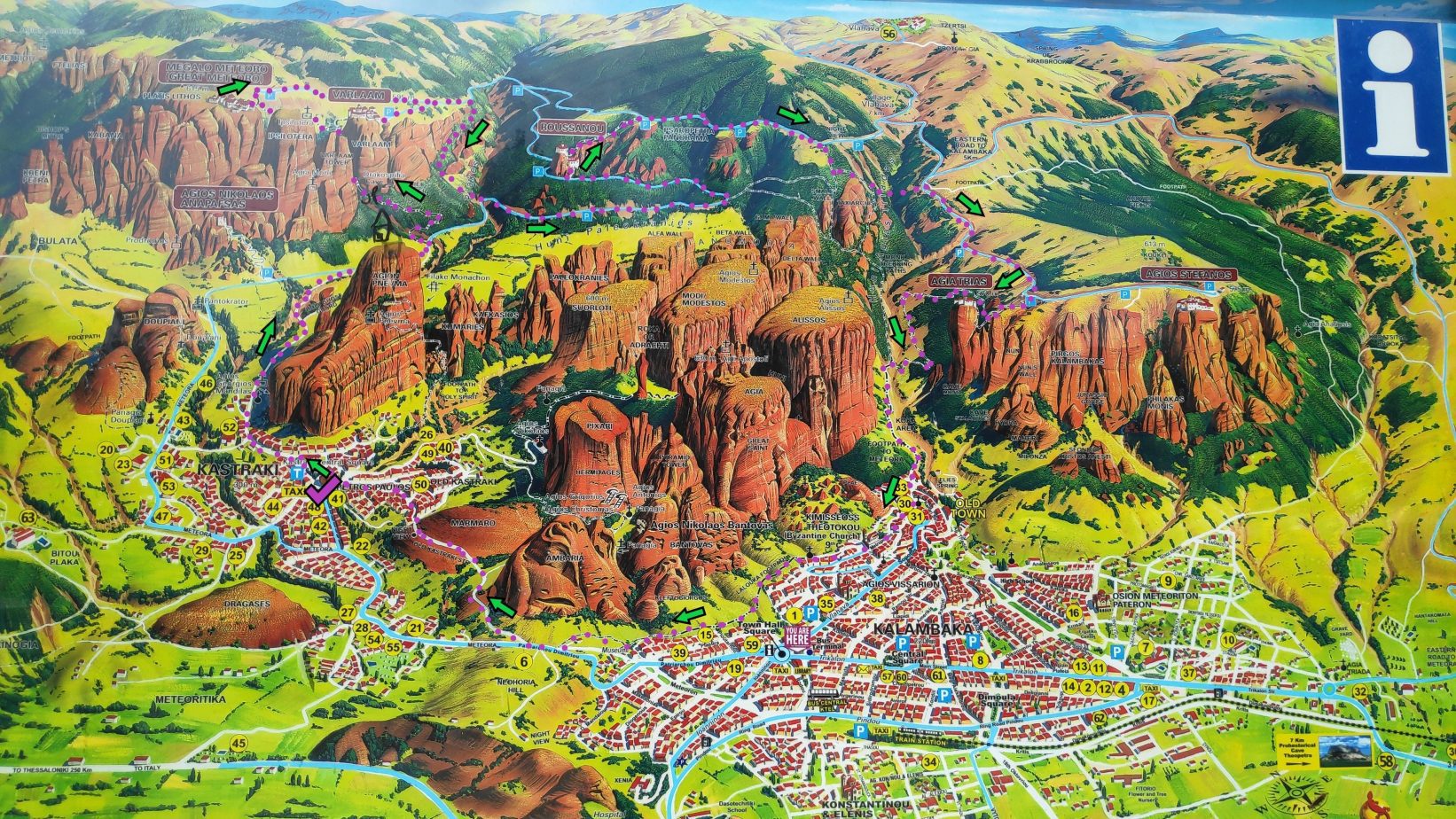 Salimos de la oficina de turismo con un mapa que representa, en tres dimensiones, las formaciones rocosas de la zona y los diversos monasterios. Entre ellos, señaliza algunos posibles senderos. Así que nos vamos a dormir con la idea de “crear” una ruta circular que una los monasterios, para así conocer rincones poco visitados y hacernos una idea más global de la zona de Meteora.