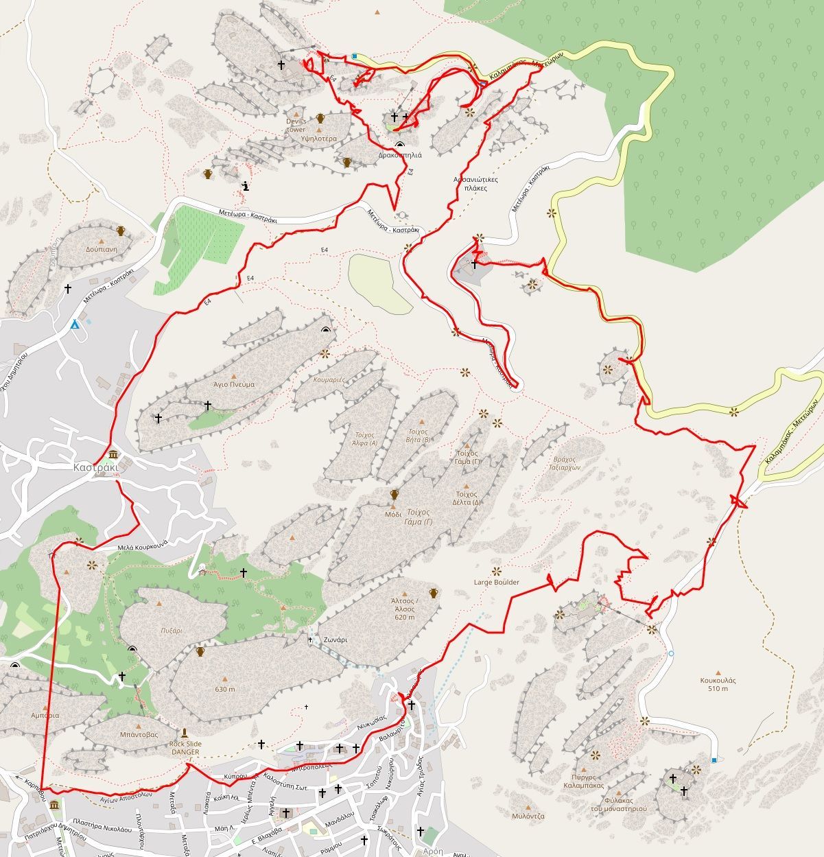 Caminamos los escasos metros que nos separan de la plaza principal de Kastraki y observamos, en un gran panel, una copia del mapa que nos entregaron el día previo en la oficina de turismo.