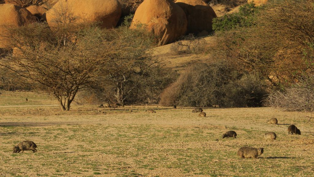 Lo primero es encontrar la zona de acampada que más nos guste. Están numeradas y separadas unas de otras por cientos de metros, por lo que debemos conducir por el parque hasta encontrar alguna que esté libre y nos guste. Según el recepcionista, las numeradas del 8 al 11 son las mejores, por lo que nos dirigimos hacia allí. Tras comprobar que una de ellas (la 9A) está repleta de agujeros en los que habitan incontables damanes del Cabo (Procavia capensis, un mamífero similar a una gran marmota), los cuales no son difíciles de ver en el parque, nos decantamos por la zona 11B. Tranquila, amplia y con bonitas vistas al amanecer y el cielo estrellado.