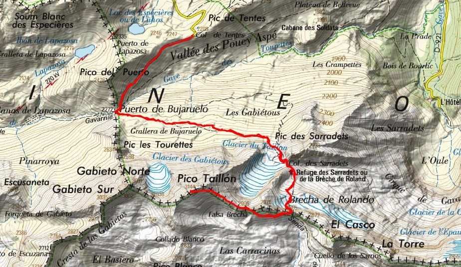 Itinerario: Col de Tentes – Puerto de Bujaruelo/Port de Boucharo – Collado Sarradets – Refugio Sarradets – Brecha de Rolando – Falsa Brecha – Taillon/Punda Negra – Falsa Brecha – Brecha de Rolando – Refugio Sarradets – Collado Sarradets – Puerto de Bujaruelo/Port de Boucharo – Col de Tentes.