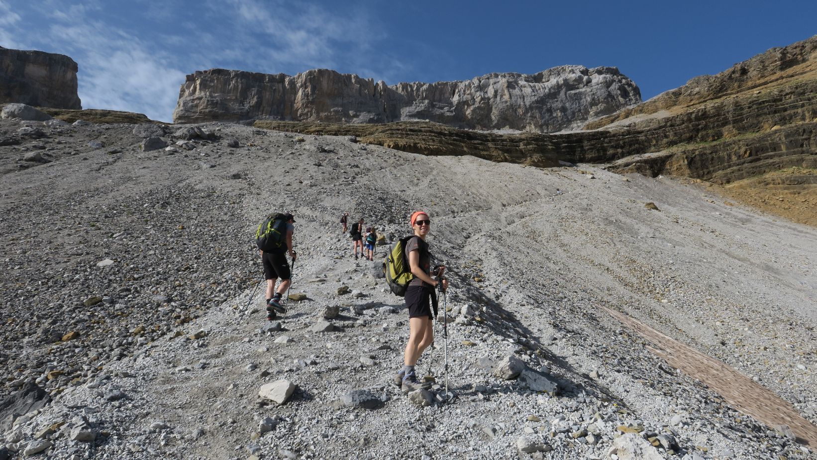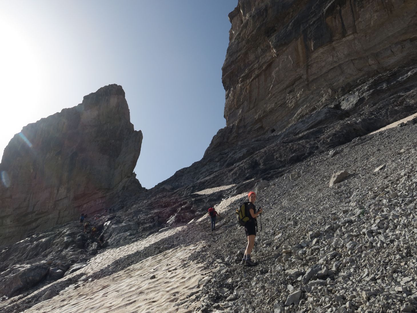 Apenas nos detenemos unos pocos minutos, puesto que enseguida caminamos hacia el oeste, bajo la extraplomada pared de la Punta Bazillac, sorteando numerosos vivacs donde algunos pasarán la noche.