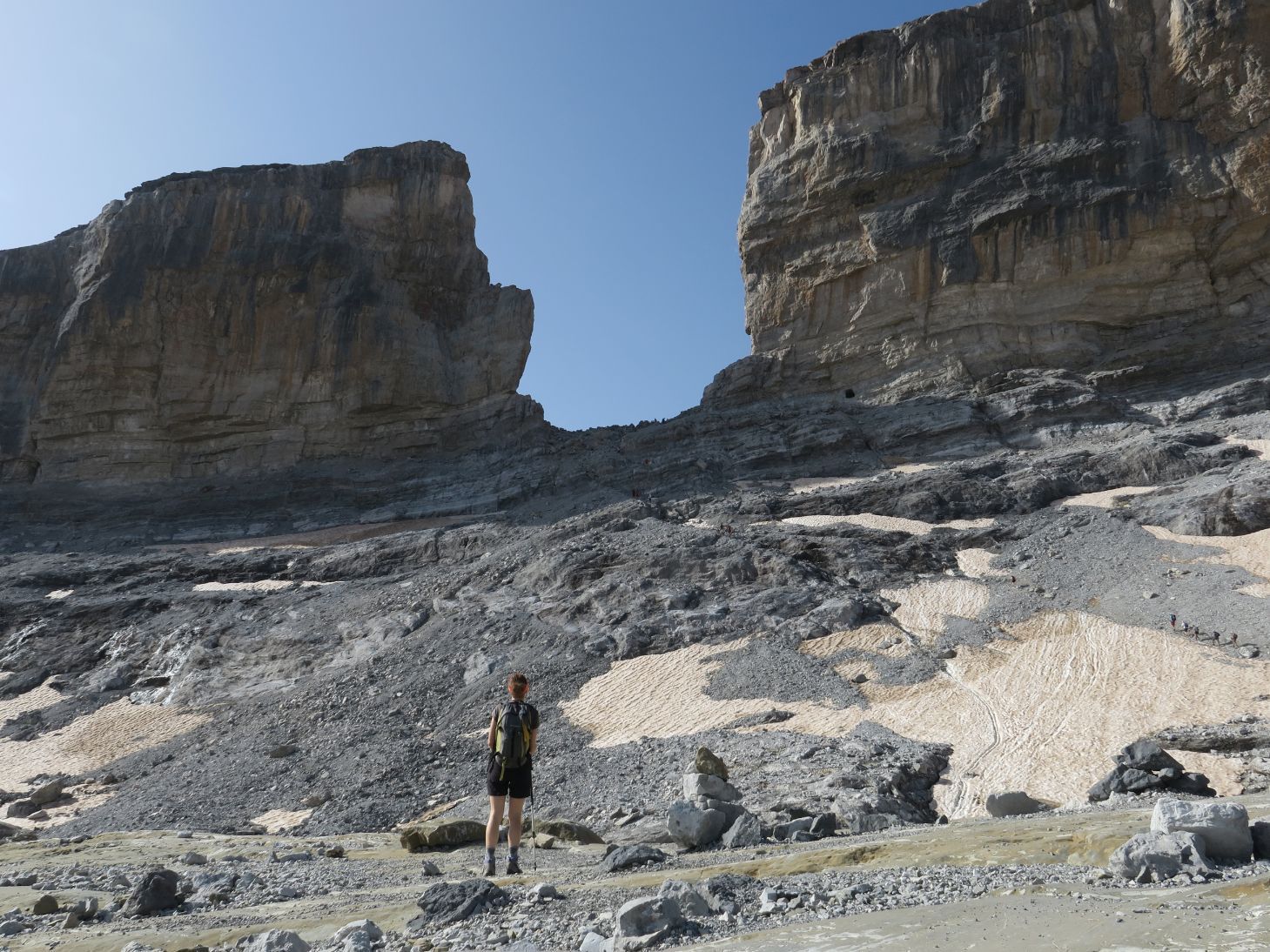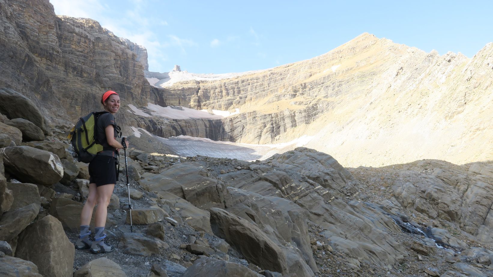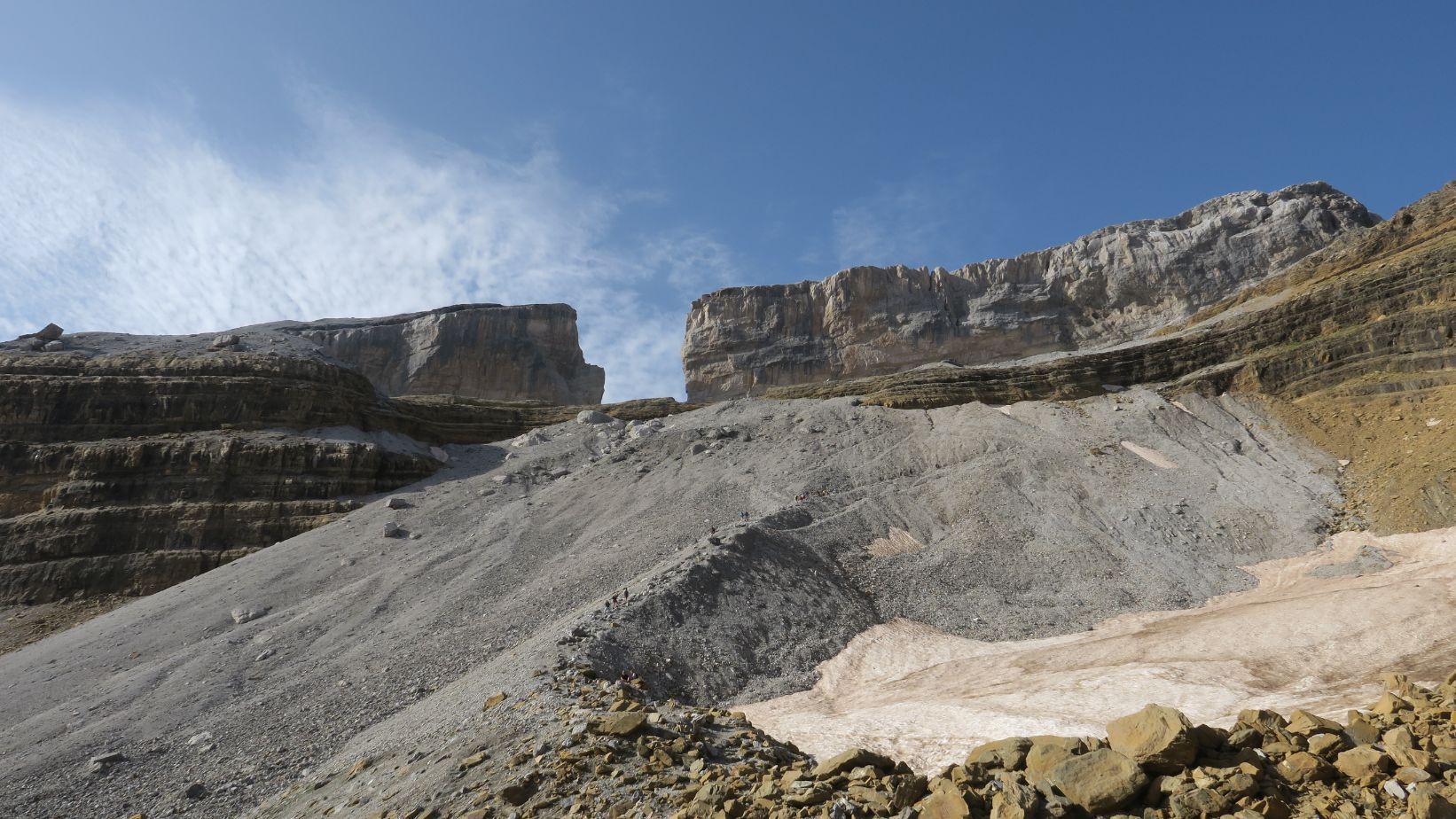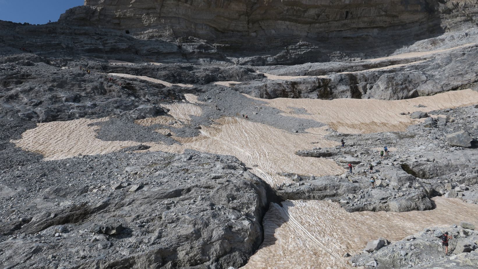 Desde aquí contemplamos los últimos neveros que resisten al intenso calor estival, vestigios de lo que en su época fue el imponente Glaciar de la Brecha, reducido en la actualidad a unos pequeños heleros que languidecen debido al calentamiento global. Triste porvenir.