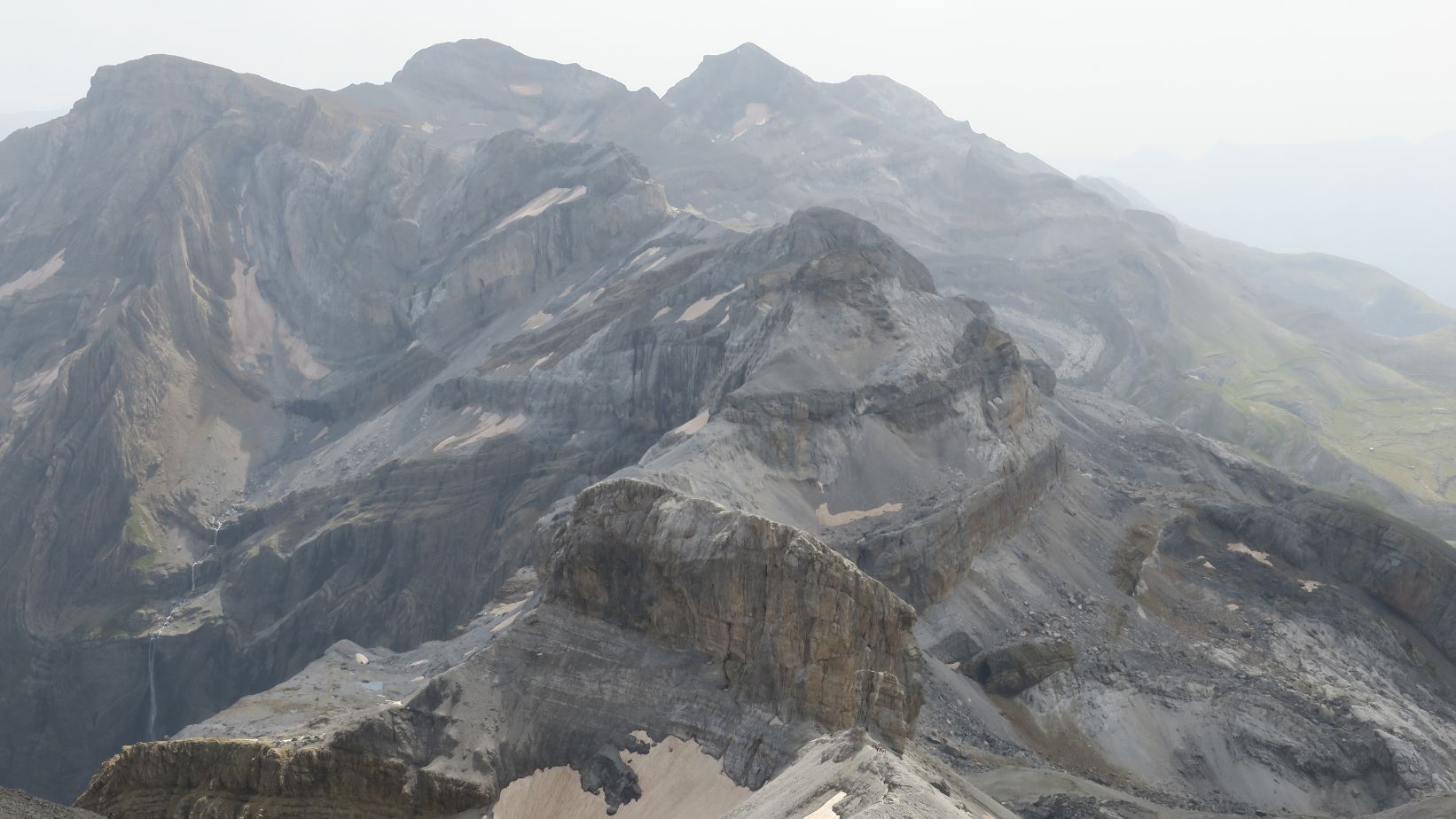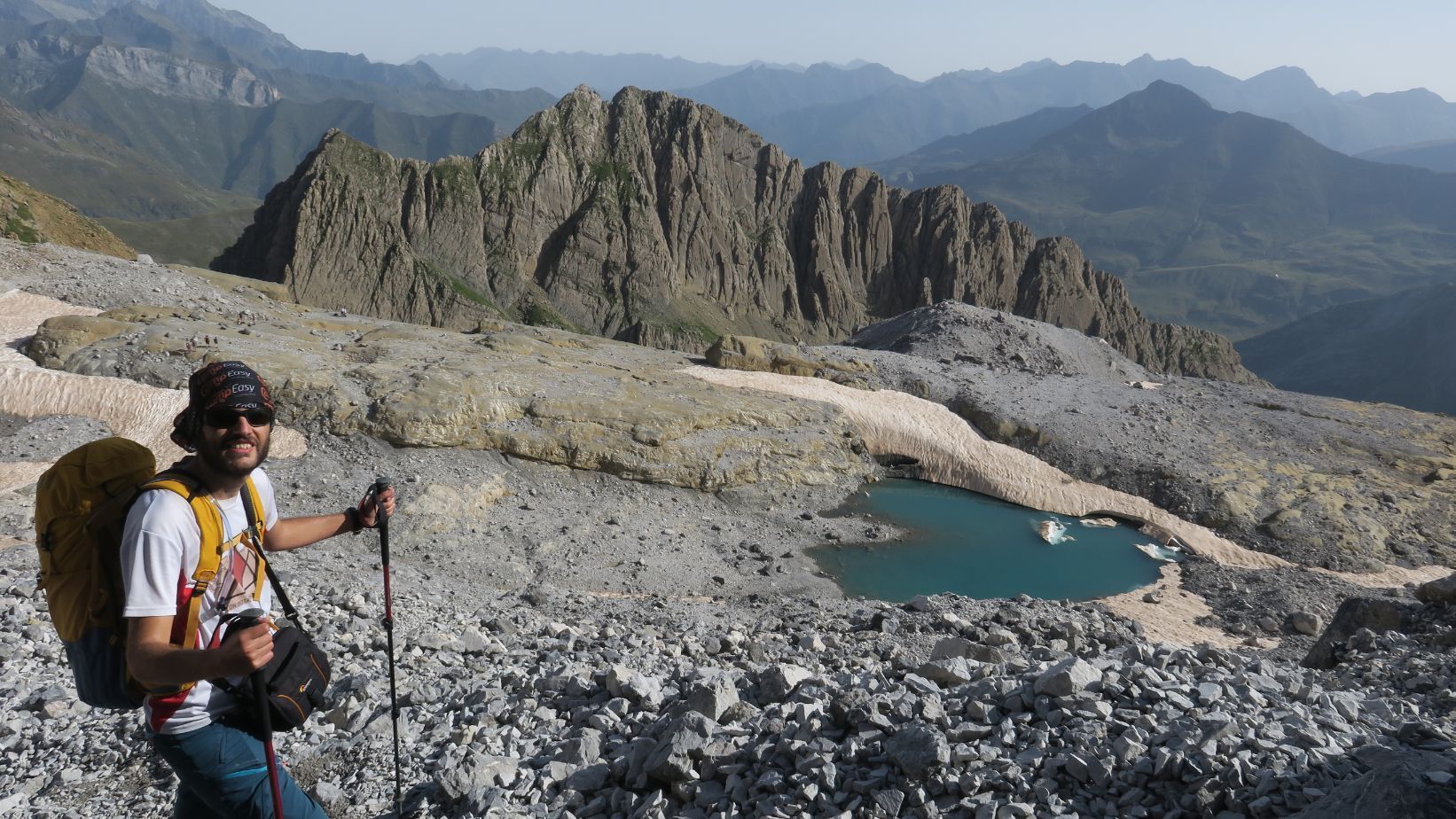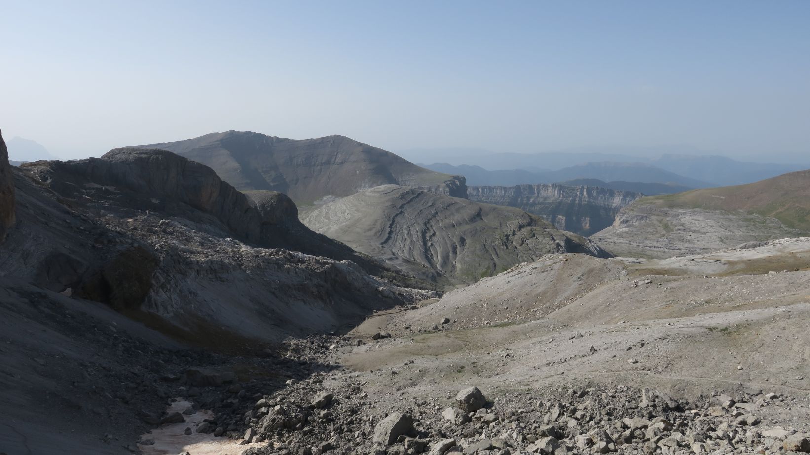 Hacia el sur los suaves relieves de la zona alta de Ordesa, que finalizan abruptamente en las paredes del valle del Río Arazas; mientras que hacia el norte divisamos una miríada de cumbres en territorio francés, todavía anónimas para quien aquí escribe, salvo el grandioso macizo del Comachibosa/Vignemale, en cuyo glaciar ya aflora oscuro hielo.