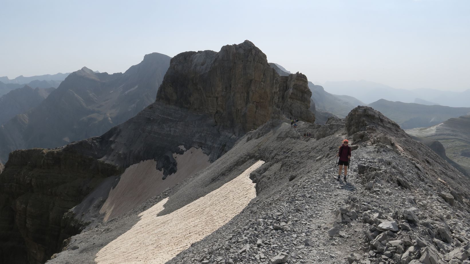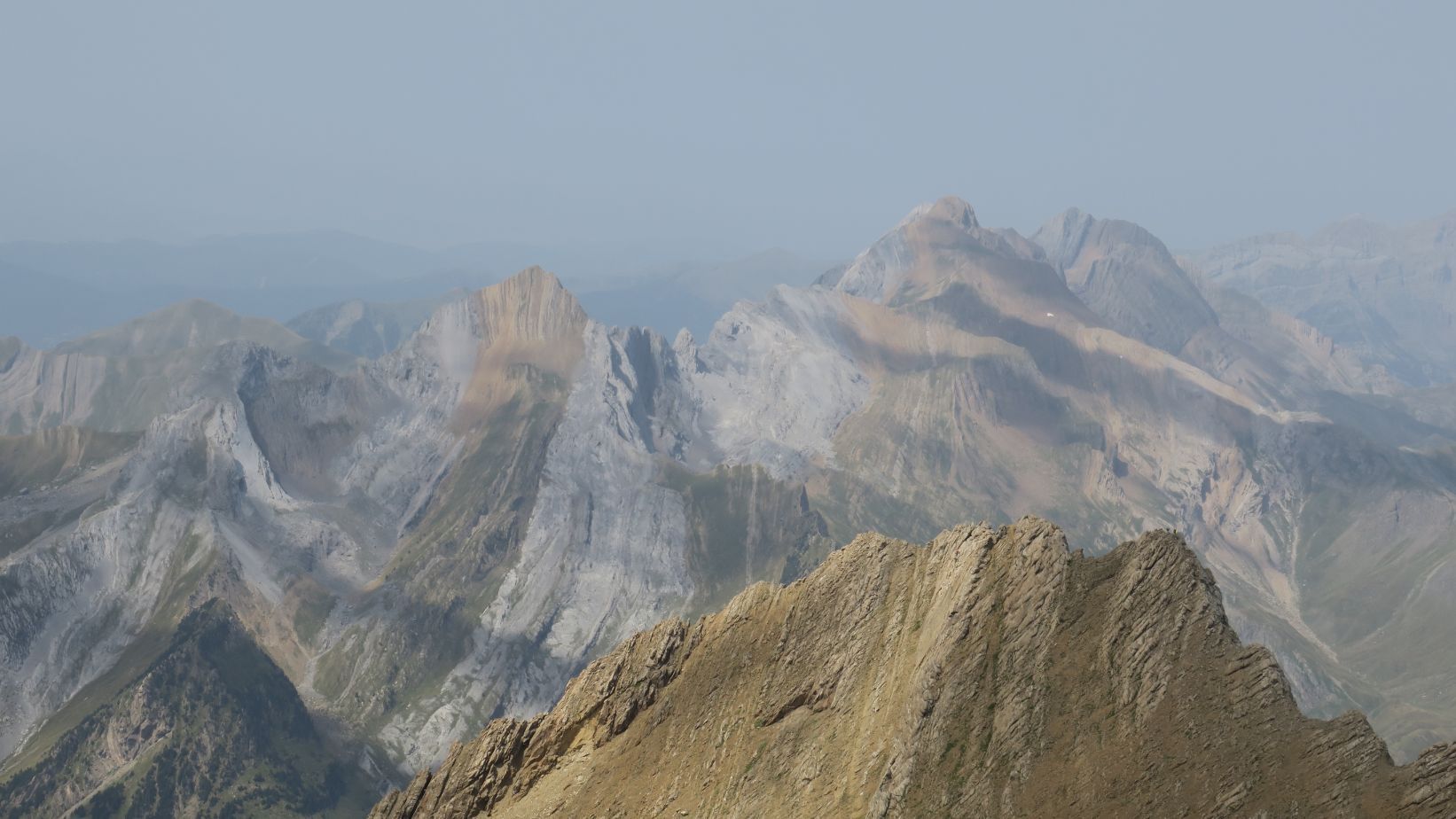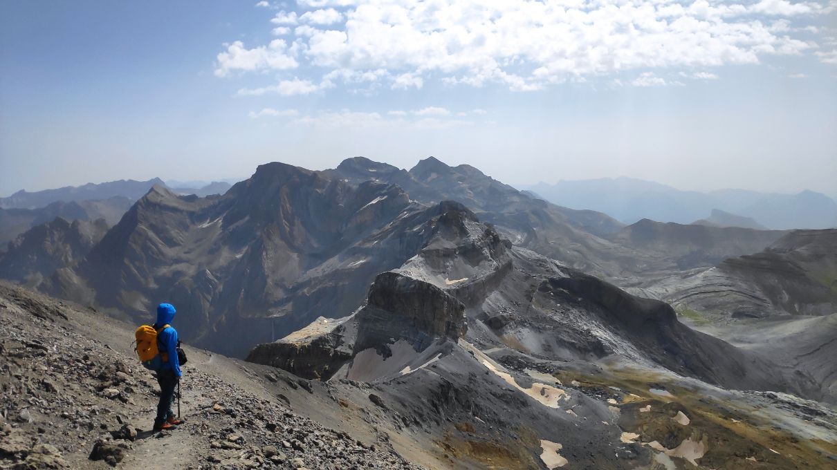 Las vistas hacia el oeste son igualmente soberbias. En primer plano los Gabietos, tresmiles más occidentales de Ordesa. Más allá toda la zona de Bujaruelo, el Valle de Otal, los picos Otal y Tendeñera. Aunque ya algo velados por la calima, incluso reconocemos la silueta de cimas más distantes, como la Peña Oroel, Collarada, Bisaurín, Anayet o Vértice de Anayet. ¡Qué barbaridad!