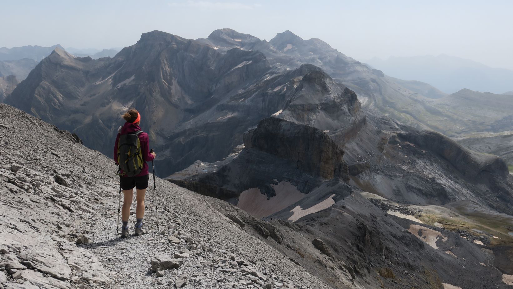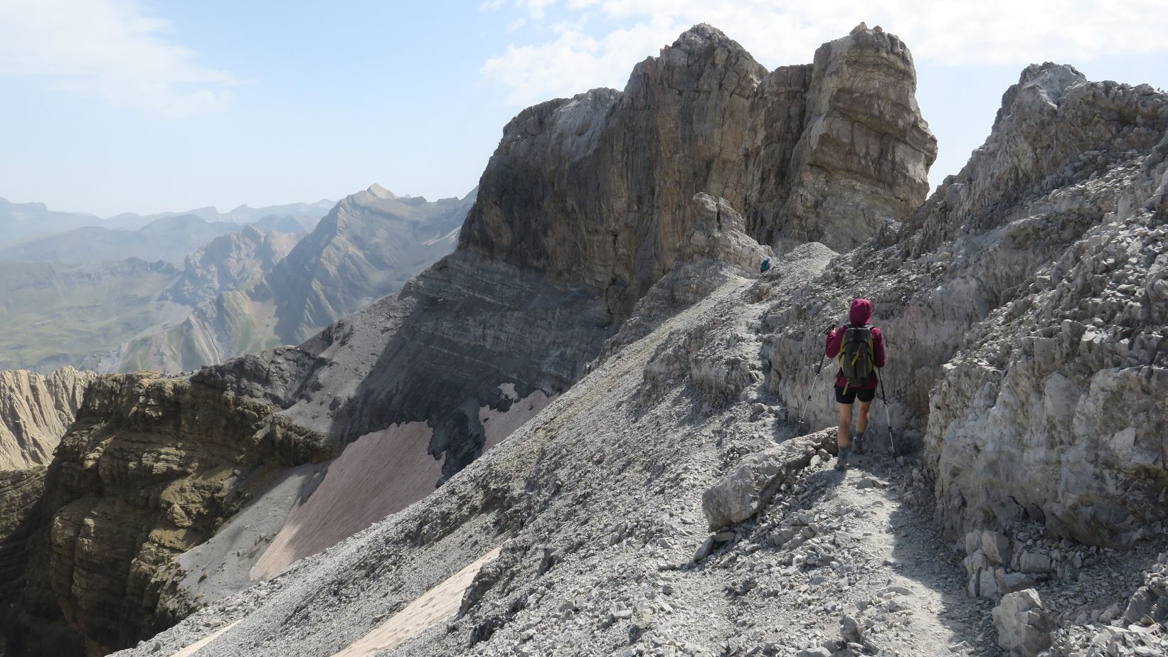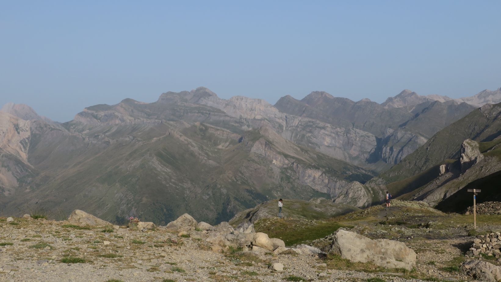 Las vistas hacia el oeste son igualmente soberbias. En primer plano los Gabietos, tresmiles más occidentales de Ordesa. Más allá toda la zona de Bujaruelo, el Valle de Otal, los picos Otal y Tendeñera. Aunque ya algo velados por la calima, incluso reconocemos la silueta de cimas más distantes, como la Peña Oroel, Collarada, Bisaurín, Anayet o Vértice de Anayet. ¡Qué barbaridad!