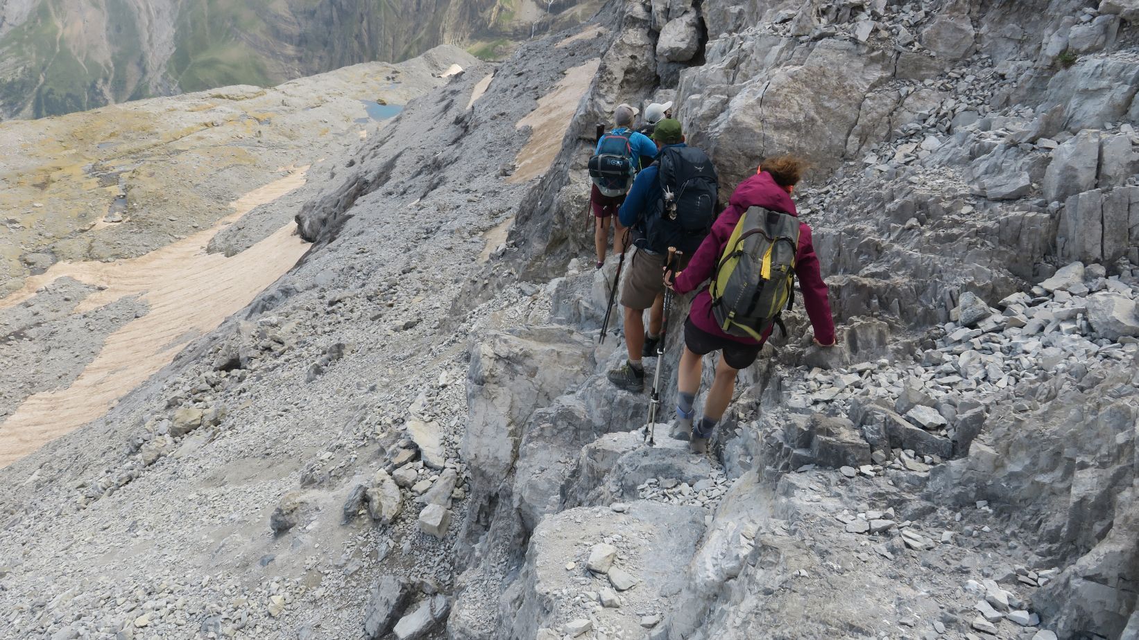 En este punto la senda cambia de vertiente, para tornarse algo más estrecha y quizá algo vertiginosa durante unos metros, en que el Glaciar del Taillon se sitúa decenas de metros bajo nuestros pies. Aunque este tramo carece de dificultad, merece extremar la precaución.