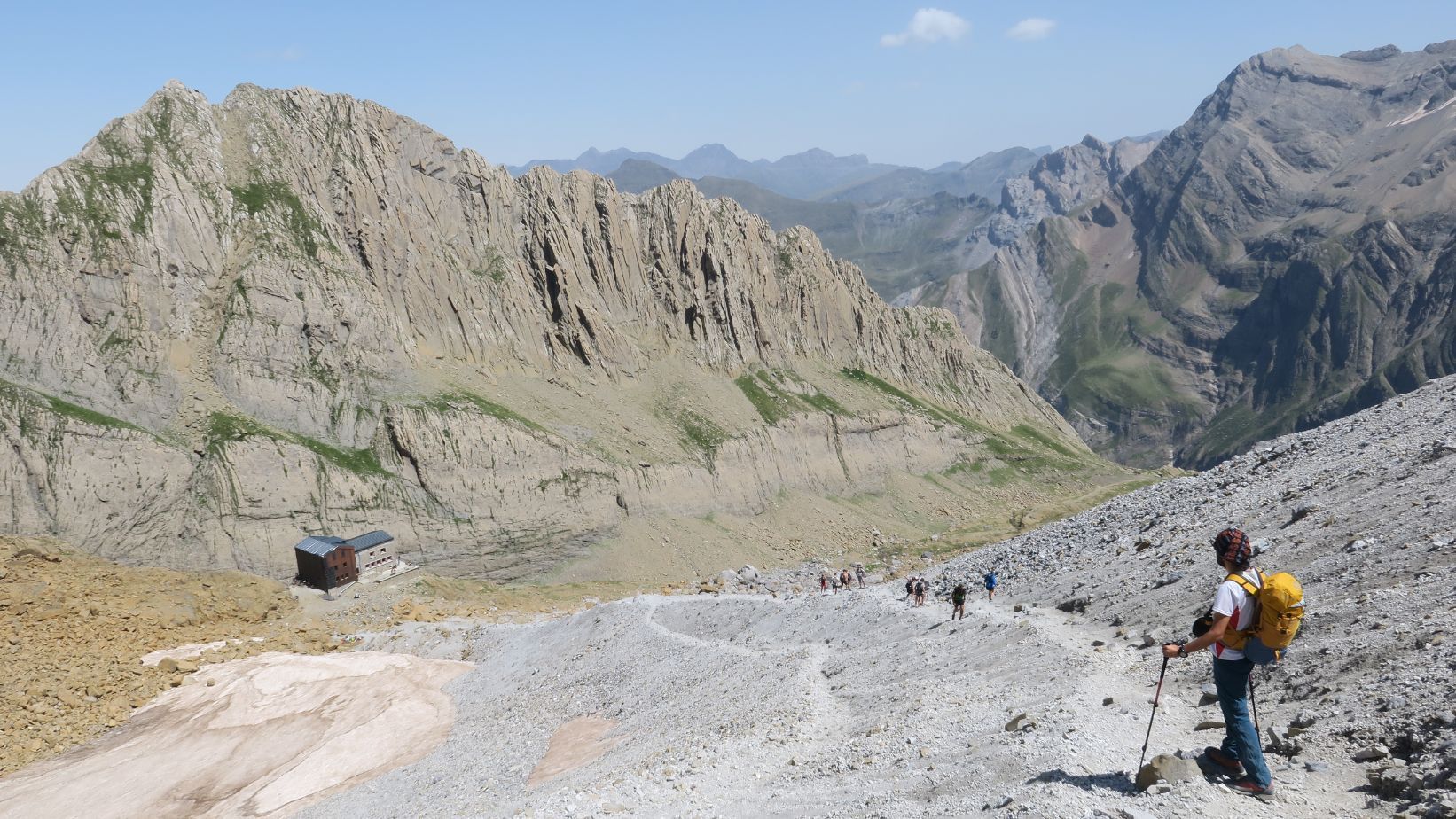 Desde el collado ya vemos, a lo lejos, la Brecha de Rolando y las moles rocosas de la Torre y el Casco de Marboré, tres miles menos populares que conforman las paredes del Circo de Gavarnie. En primer plano divisamos el Refuge de la Brèche (o de Sarradets), cuyas obras de ampliación han finalizado recientemente. Enseguida llegamos al refugio, donde hay baños y podemos rellenar agua (5,1 km; 1 hora y 30 minutos; 2587 metros).