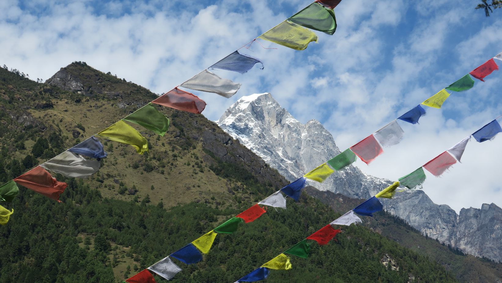 Pronto divisamos, en primer plano, la localidad de Monjo, con la imponente figura del Kumbila/Kumbu Yui Lha (5761 metros) de fondo. Apenas nos queda descender unos metros por una parte del camino empedrada, cruzar un pequeño puente y remontar unos metros más para alcanzar la localidad de Monjo, final de la etapa de hoy.