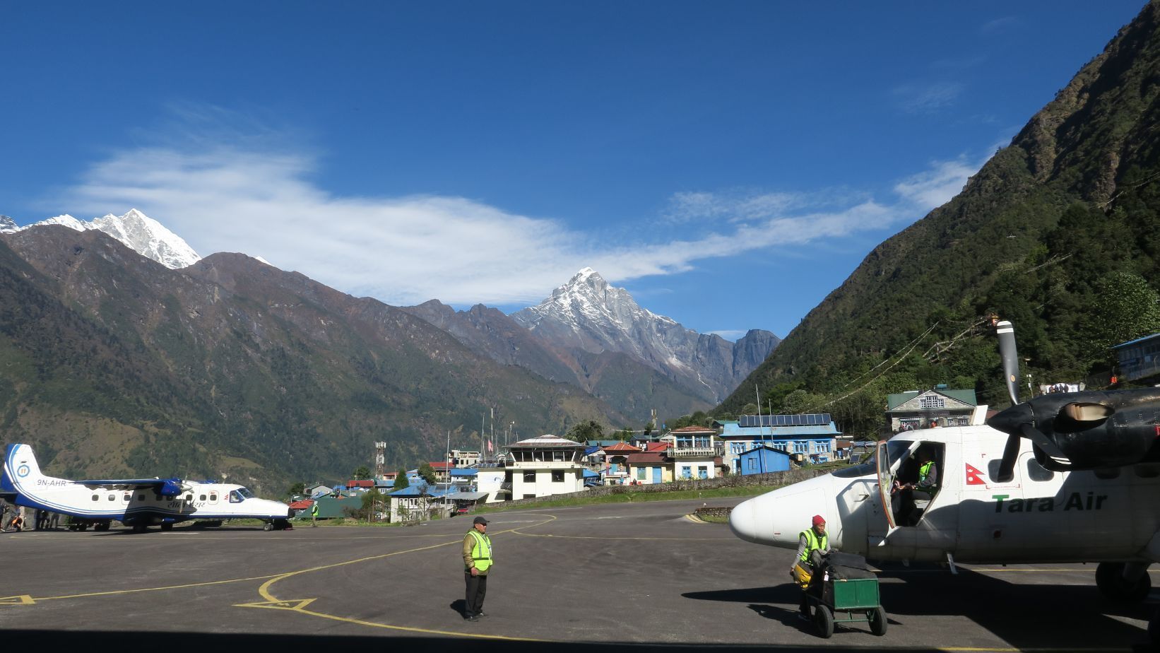 Llegamos a la población de Lukla tras un agradable y corto vuelo, de apenas veinte minutos, que nos ha traído desde el Aeropuerto de Ramechhap. Recogemos nuestras mochilas, pesadas, y salimos del siempre ajetreado Aeropuerto de Lukla.