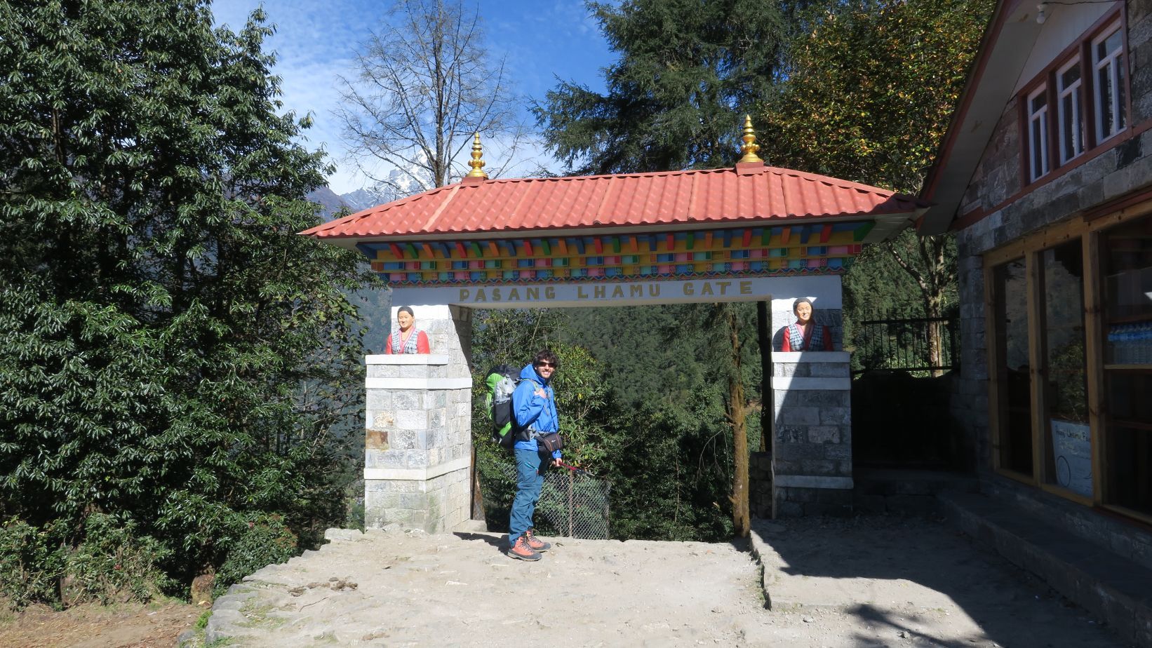 Ya con el mapa en nuestro poder seguimos recorriendo la población, con bastante ambiente, hasta llegar a la Pasang Lhamu Gate, la puerta de salida de la población. Descendemos unas pocas escaleras y enseguida reparamos en un gran edificio situado a mano derecha. Es allí donde debemos pagar el permiso del trekking (2000 rp/16 € por persona); además, nos dan la recientemente creada Trekkers Card, que permitirá en un futuro el control y la seguridad de los senderistas de manera más rápida y fiable.