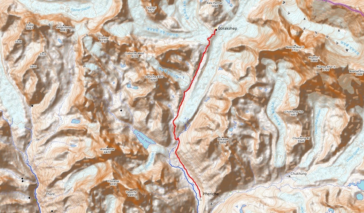 Tipo de ruta: al comienzo ida y vuelta; desde Gorakshep hasta Pheriche lineal.