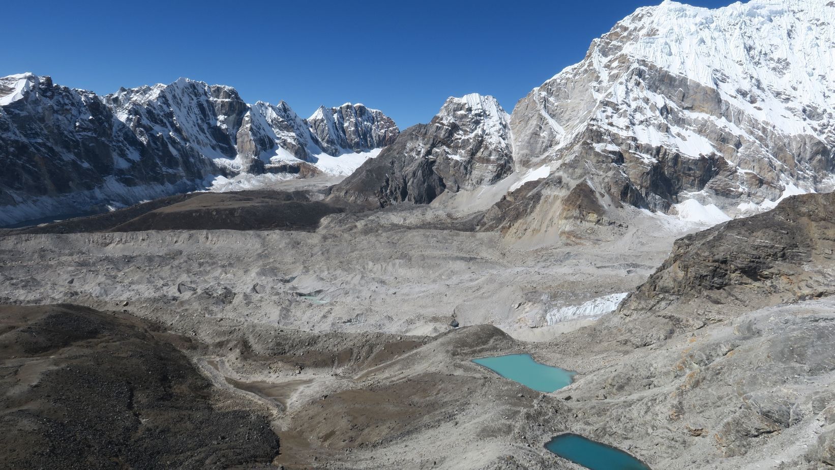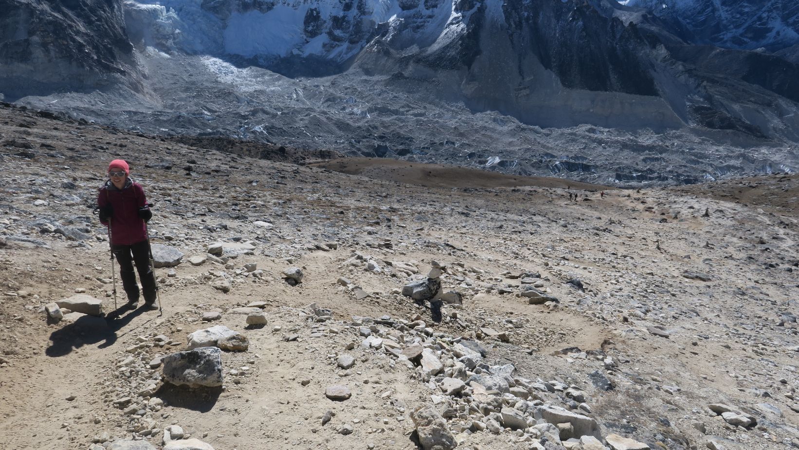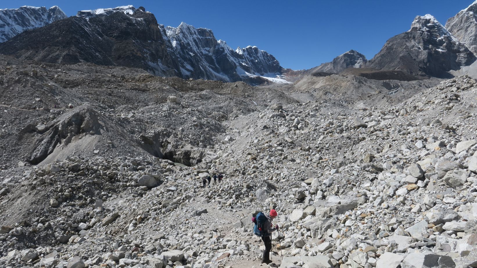 Comenzamos la segunda parte de la ruta, descendiendo ya por el camino realizado a la ida, que va perdiendo altitud progresivamente, mientras atraviesa la lengua de los glaciares Changri Nup y Changri Shar. Pasamos con precaución este terreno rocoso y, a buen ritmo, no tardamos demasiado en llegar de nuevo a Lobuche (4,75 km desde Gorakshep; 1 hora y 50 minutos; 4928 metros de altitud).