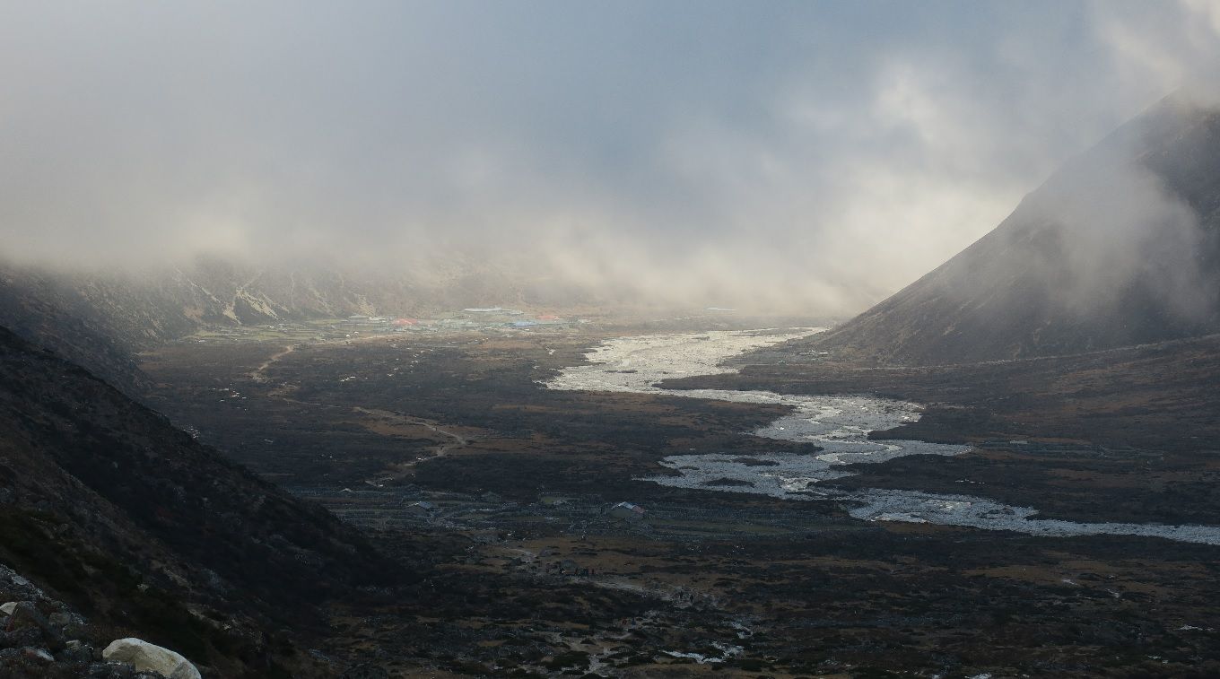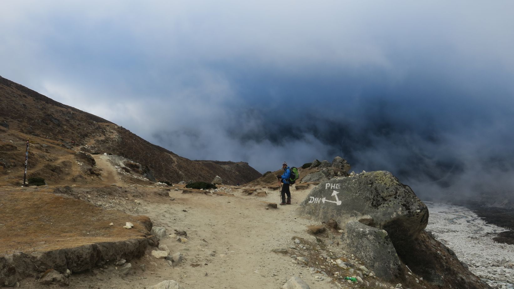 Tras superar el potente río situado junto a Dughla, por un vetusto puente, debemos prestar atención al desvío, señalizado en una gran piedra, en el que divergen los caminos a Pheriche y a Dingboche. Nosotros tomamos el de la derecha, que desciende por un pequeño valle colgado, sumido en la niebla, que le otorga un ambiente mágico. No obstante, nos impide ver las estupendas panorámicas que, sin duda, nos ofrecería este tramo de la ruta.