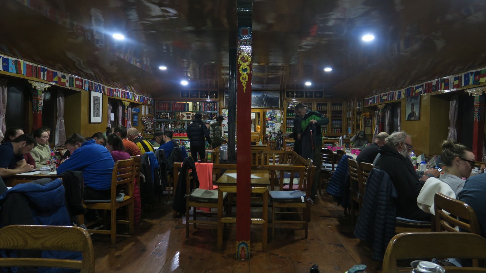 Así, llegamos a la población de Pheriche (12,42 km; 4 horas y 35 minutos; 4265 m). Entramos a nuestro alojamiento, donde ya nos esperan y nos tienen reservada una habitación y una mesa en la concurrida zona común. Dejamos las mochilas, tomamos unas merecidísimas tazas de té y damos cuenta de una abuntante cena.