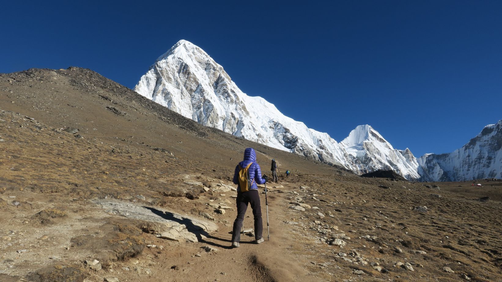 El camino no tiene pérdida, puesto que la cumbre del Kala Pattar se alza ahí delante, bajo el siempre impresionante Pumori. A nuestra derecha asoma la cumbre del Everest, mucho más visible que ayer.