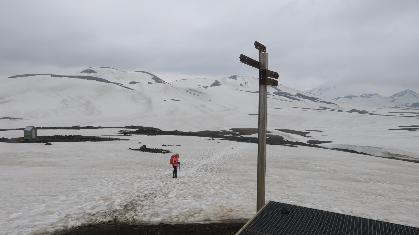 Poco después, uno de los escasos paneles indicadores que encontramos a lo largo de la ruta nos confirma que nos hallamos en el camino adecuado y que nos quedan 5,3 kilómetros hasta nuestro próximo destino, el Refugio de Álftavatn.