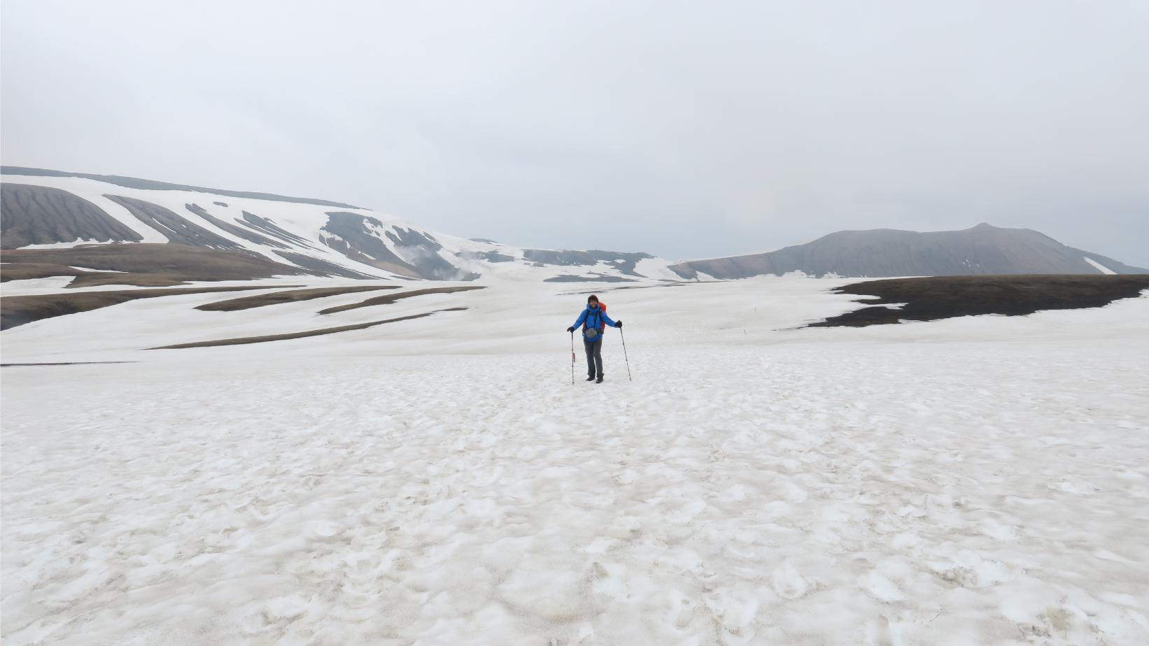Sumidos en la niebla comenzamos a descender por un terreno algo más escarpado, sorteando algunos puentes de nieve de gran tamaño. Nos topamos con algunas pequeñas fumarolas y con gigantescas acumulaciones de nieve, probablemente debidas a las ventiscas, cuya altura calculamos puede superar los diez metros.