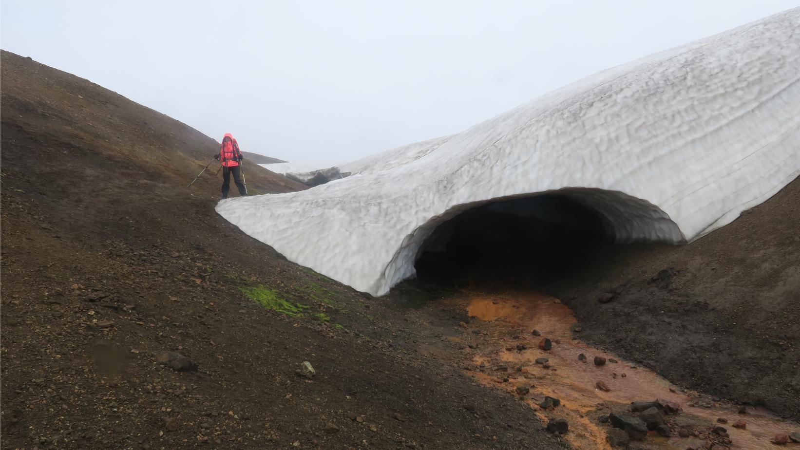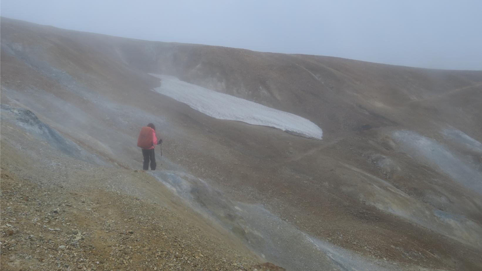 – El entorno de Hrafntinnusker, situado en torno a los mil metros de altitud, suele estar nevado y, con cierta frecuencia, con niebla.