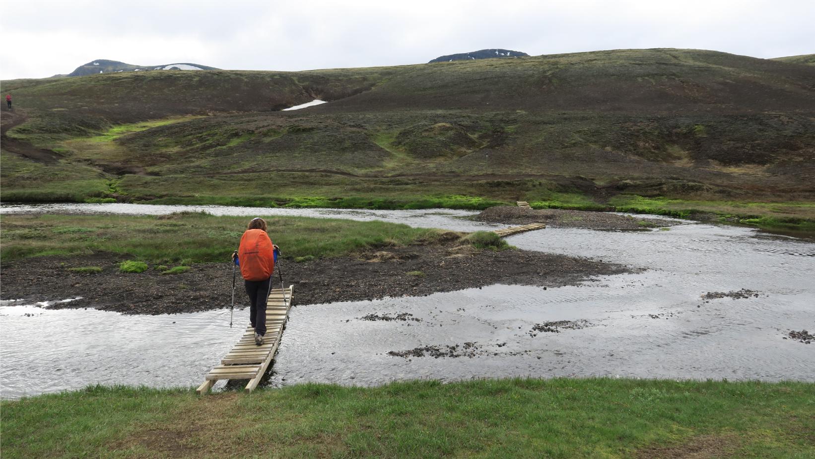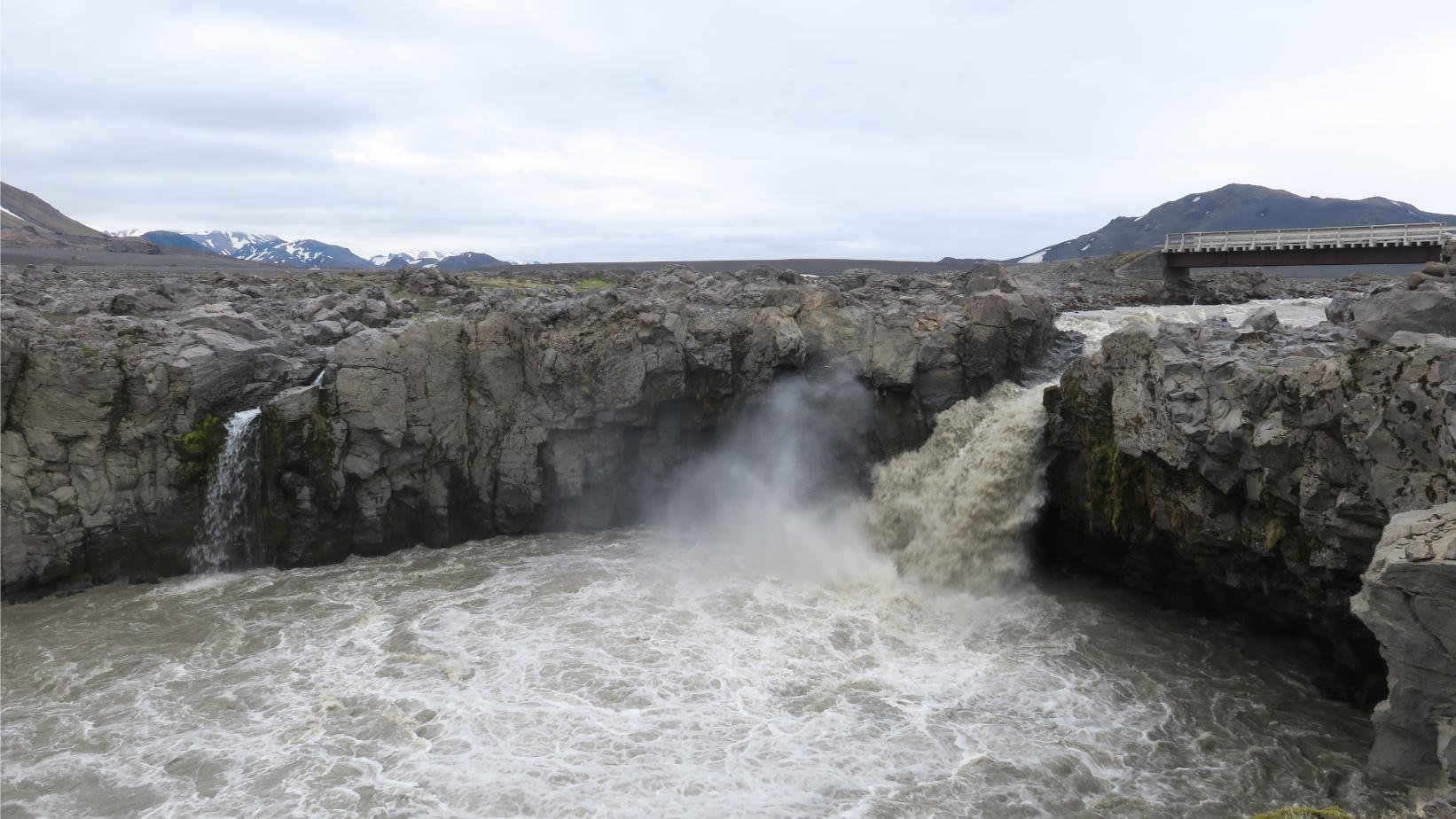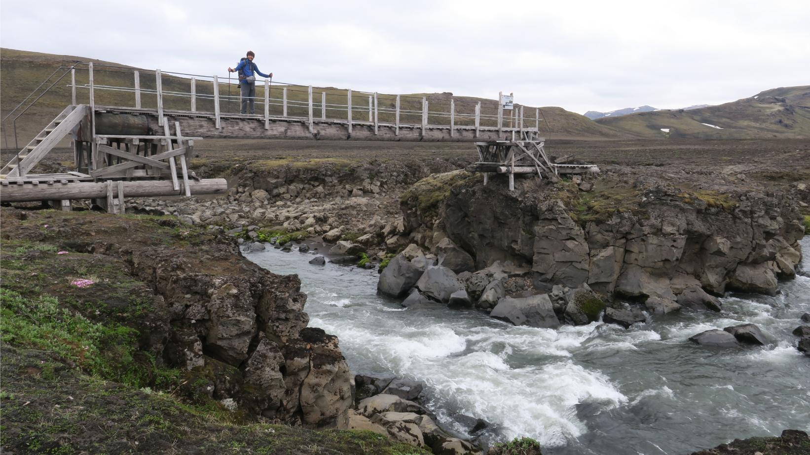 Este paisaje más pesado y repetitivo se ve truncado por el potente Río Innri-Emstruá (9,23km; 3 horas y 30 minutos; 544 metros). Probablemente el más caudaloso de todo el trekking, ruidoso y espectacular. Con el paso del tiempo ha labrado un pequeño cañón de varios metros de profundidad, el cual atravesamos por un gran puente.