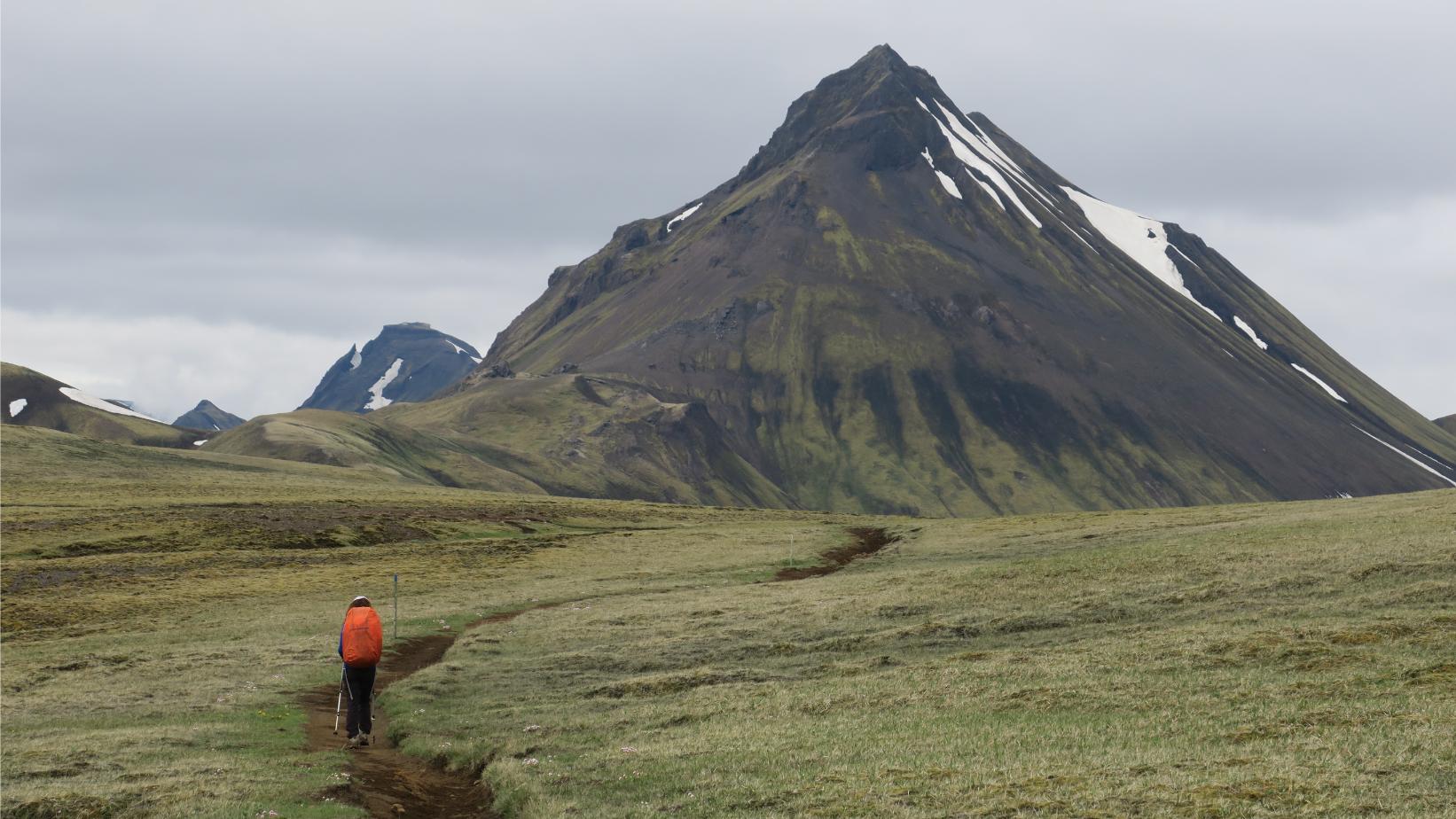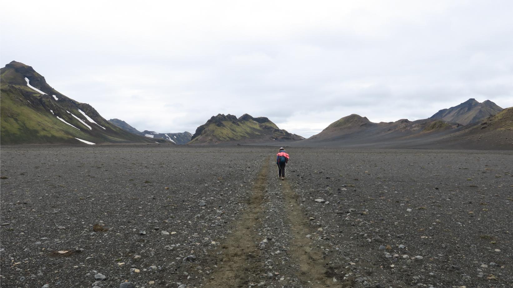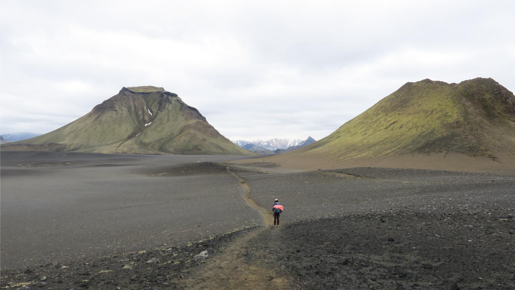 Tras un buen rato vamos llegando al final del valle, en su extremo suroeste. La senda comienza un tramo de ascenso algo más duro, aunque sin complicaciones, para alcanzar una suerte de collado desde el cual las vistas son extensísimas. Glaciares inmensos, llanuras negruzcas y algunas cumbres sobrecogedoras, como Hattfell (924 m), que se yergue, altivo, a nuestra derecha.