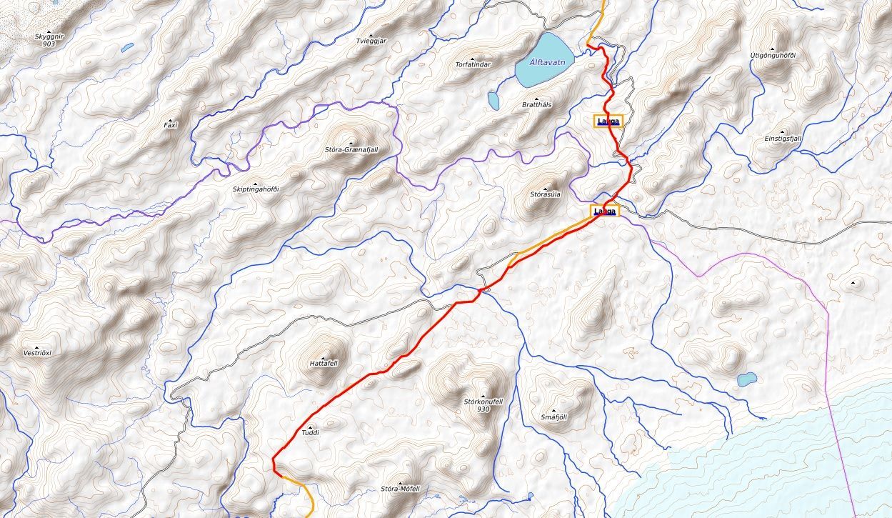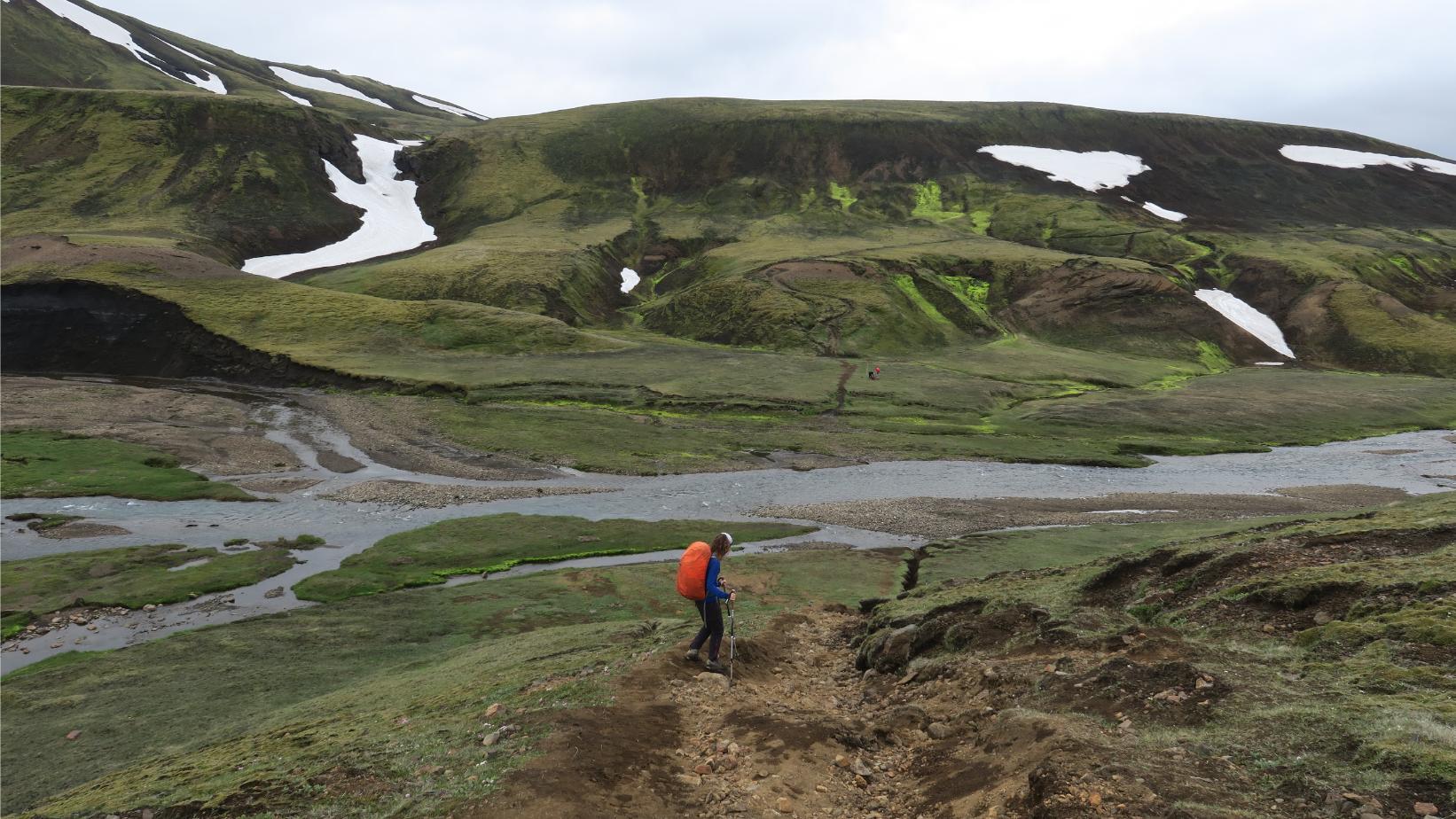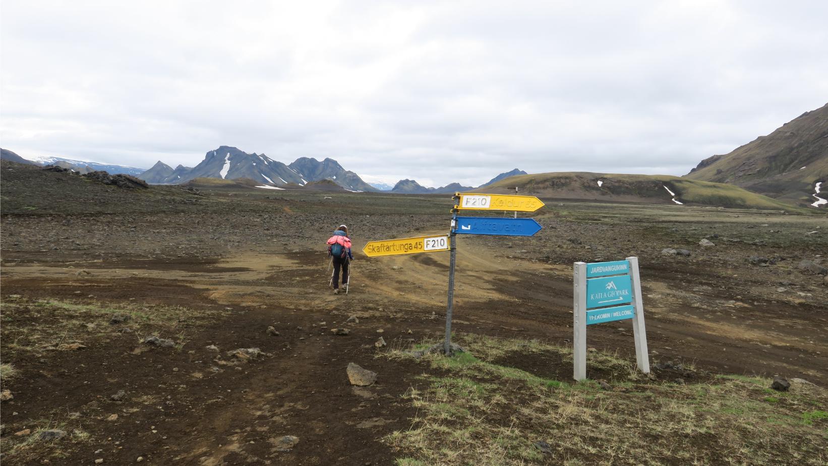 La esbelta Stórasúla sigue siendo la gran protagonista, quedando a mano derecha mientras la comenzamos a rodear por el sur. Así, tras un breve repecho, cruzamos una pista (carretera F210) y seguimos por la senda, donde un largo y suave descenso nos aproxima al Refugio de Hvanngil (4,11 km; 1 hora y 35 minutos; 573 metros de altitud), donde también hay una amplia zona de acampada.