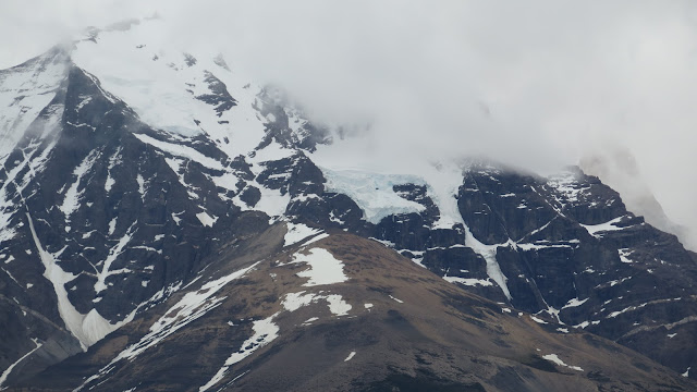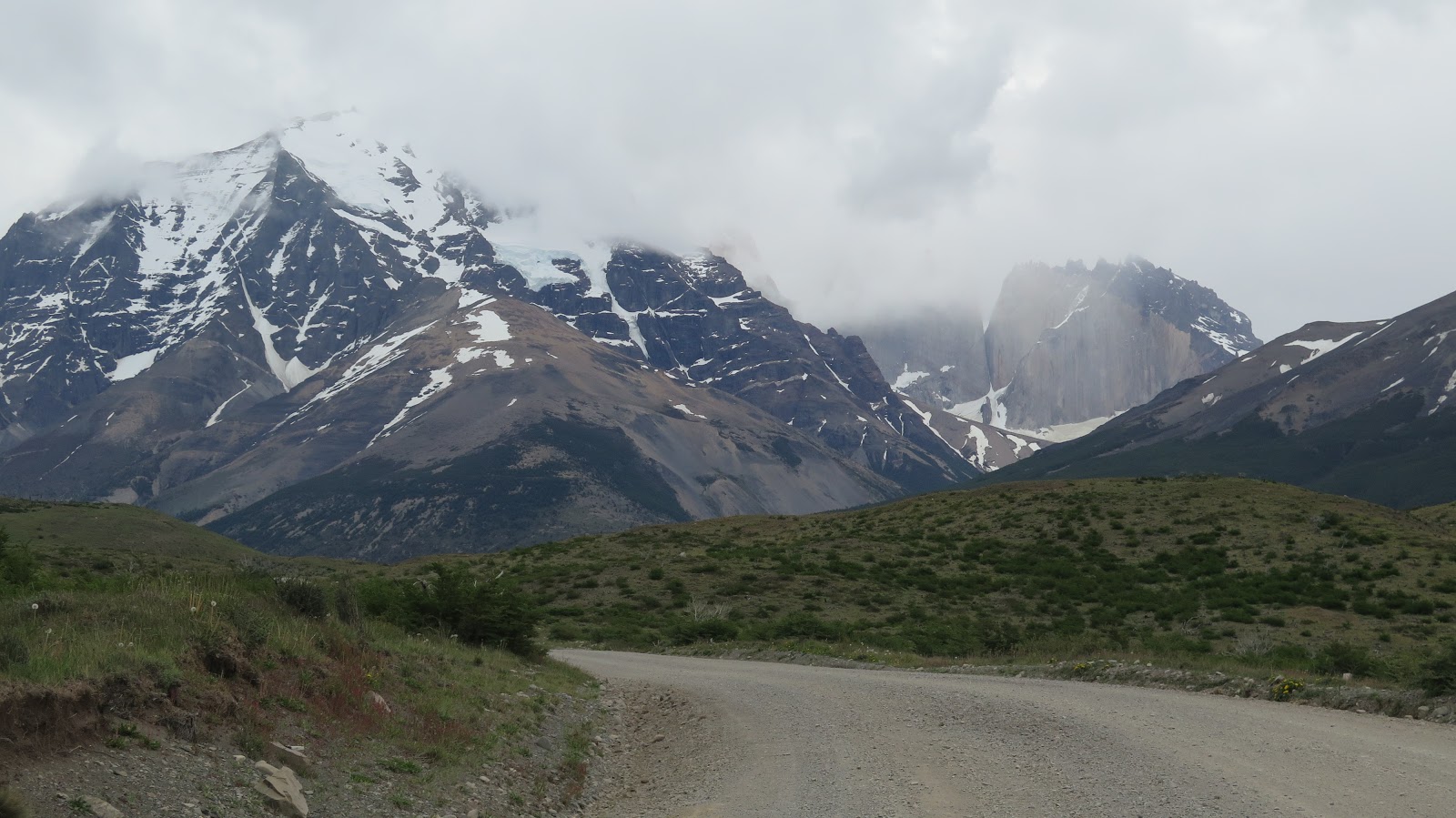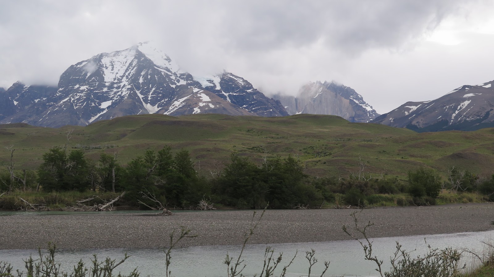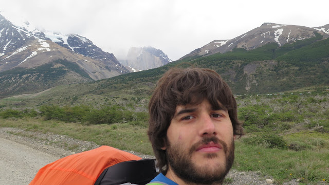 Ganamos algo de altura, lo que nos permite empezar a tener una perspectiva de la zona: a nuestras espaldas queda ya lejos Laguna Amarga; al frente, intentando asomar entre las nubes, las cimas del Monte Almirante Nieto y de las Torres del Paine. Se trata tan solo de un aperitivo de lo que nos espera en los próximos días, pero estamos emocionados.