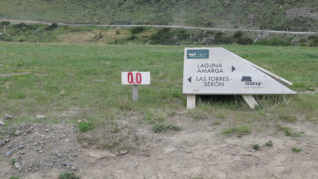 Son las 17:30 horas cuando comenzamos a caminar desde Laguna Amarga, en dirección a la Hostería Las Torres, por una pista en buen estado (por aquí circula el autobús). La temperatura es agradable, aunque hoy el día es nublado. A lo lejos vemos ya algunas imponentes montañas que se elevan verticalmente hacia el cielo.