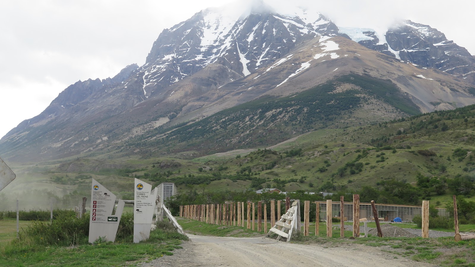 Entramos, a través de la puerta, en terreno privado. Al fondo ya se intuyen las edificaciones de la Hostería Las Torres.